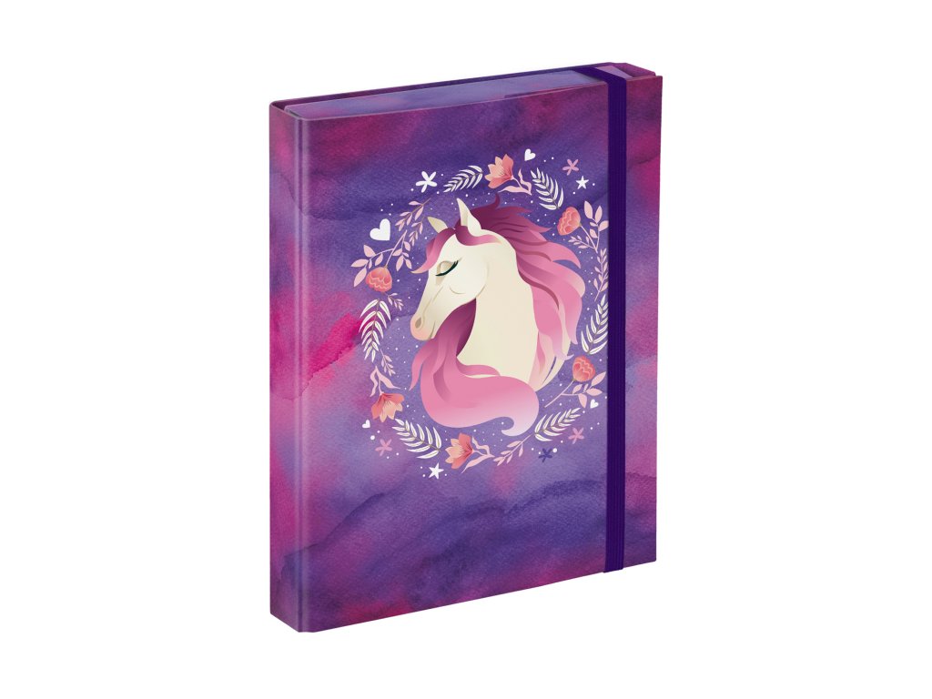 Fialové desky na školní sešity ve formátu A4 s obrázkem koně.