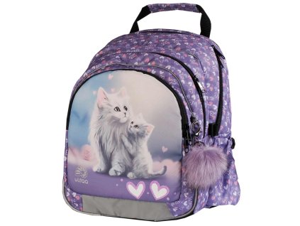 Školní batoh české výroby s roztomilými koťátky pro dívky od 1. třídy ZŠ. Taška sedí na zádech většiny dětí s výškou 115 až 135 cm.