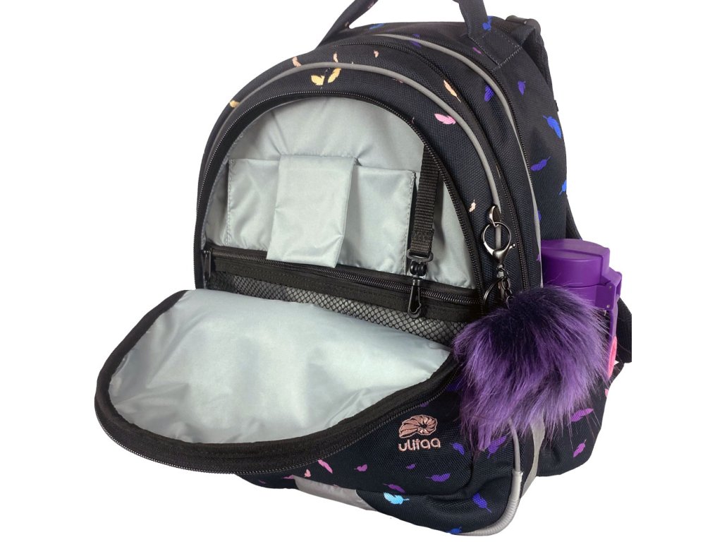Hlavní komora poskytuje dostatek prostoru i pro pohodlné umístění desek na sešity o velikosti A4. Prostřední lze využít například na uložení svačinového boxu, penálu nebo vaku na přezůvky. V přední kapse je malý organizer, karabina na klíče a síťovaná kapsička na drobnosti. Na bocích jsou dostatečně velké kapsy na láhev nebo deštník.