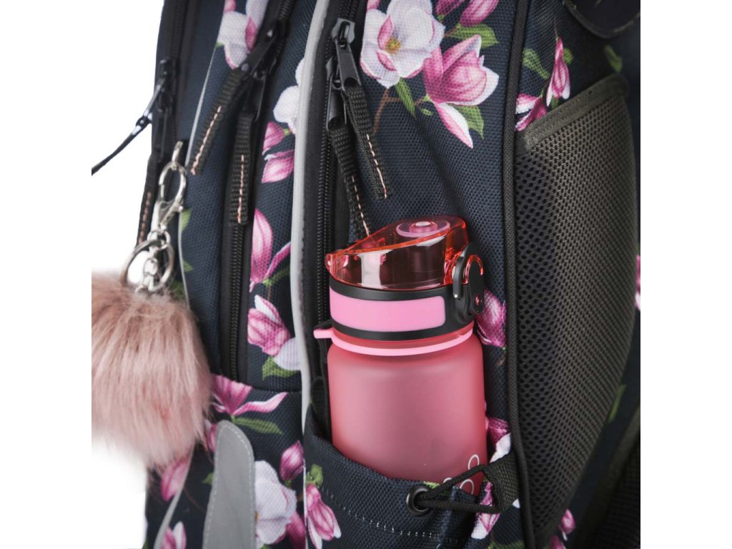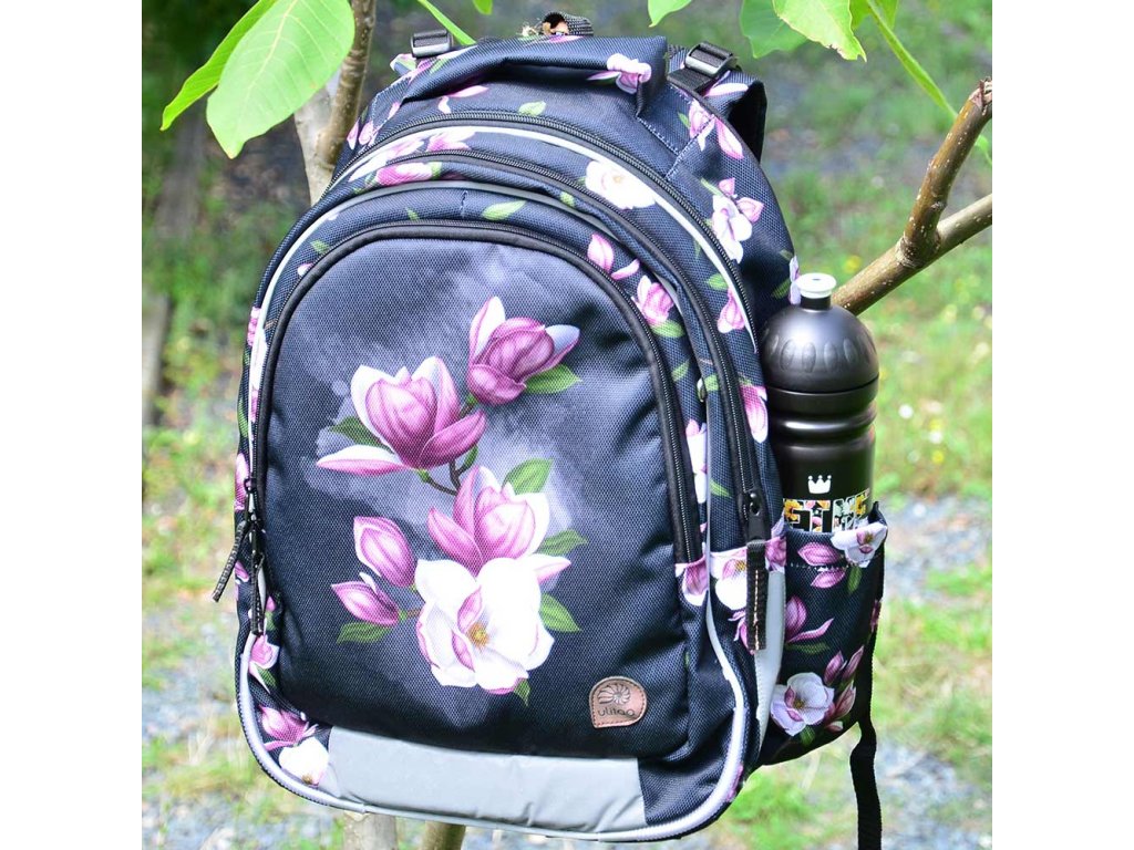 Nový školní batoh s motivem magnólie, který byl vyvinut a vyroben v České republice a je vhodný pro většinu dětí vysokých 134 – 152 cm.