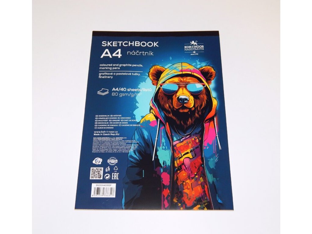 Lepený blok – školní náčrtník pro pastelky, grafit. tužky. Na přední obálce v horní části mašle, barevný motiv Plyšáci, formát A4 – 40 listů, 90 g/m2. Zadní část obálky: karton. Lepení v hlavě. Rozměr 297 x 210 x 6 mm.