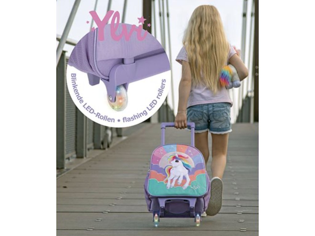 Technické údaje v textu: rozměry 44 × 31 × 19 cm • hmotnost 1 130 g • kolečka: 2 plastová, svíticí • rukojeť: výsuvná (trolley) • zapínání: dva zipy • kapsy: přední zipové • konstrukce: vyztužené stěny • motiv: jednorožec • značka: Ylvi.