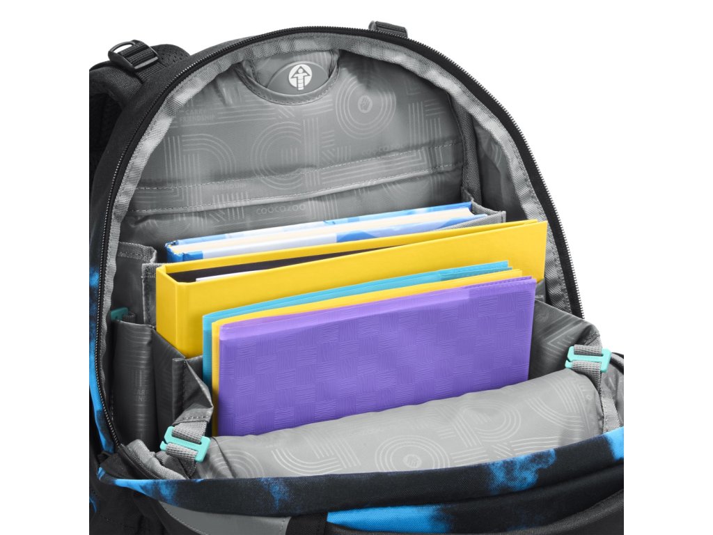 Hlavní kapsa je prostorná, obsahuje přihrádku na knihy a odnímatelnou přepážku. Druhá kapsa slouží jako organizér na drobnosti a přední kapsa je ideální například na svačinovou krabičku. Extra velký vstup do hlavní kapsy zajišťuje perfektní přehled. Uvnitř je možnost připevnění organizéru na tablet (prodává se samostatně).