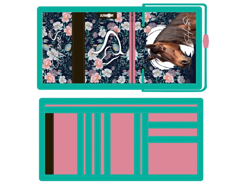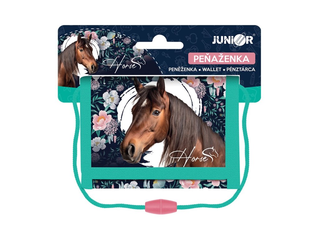 Dětská peněženka JUNIOR S8 Kůň je ideální doplněk pro všechny malé milovnice koní 🐴💗. Má praktické rozložení přihrádek a příjemný textilní materiál, takže je vhodná do školy, na výlety i na kroužky.