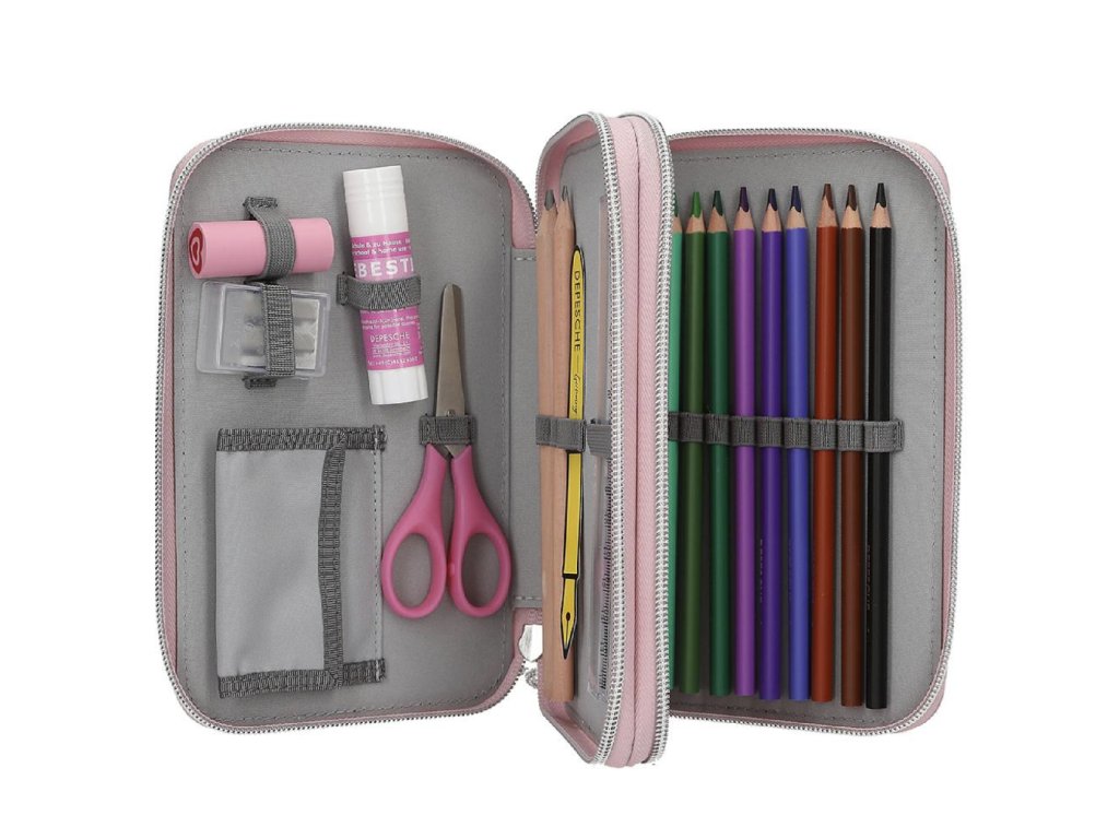 Penál má dvě samostatná patra uzavíratelná na zip, takže všechny pomůcky budou vždy krásně přehledně uložené.