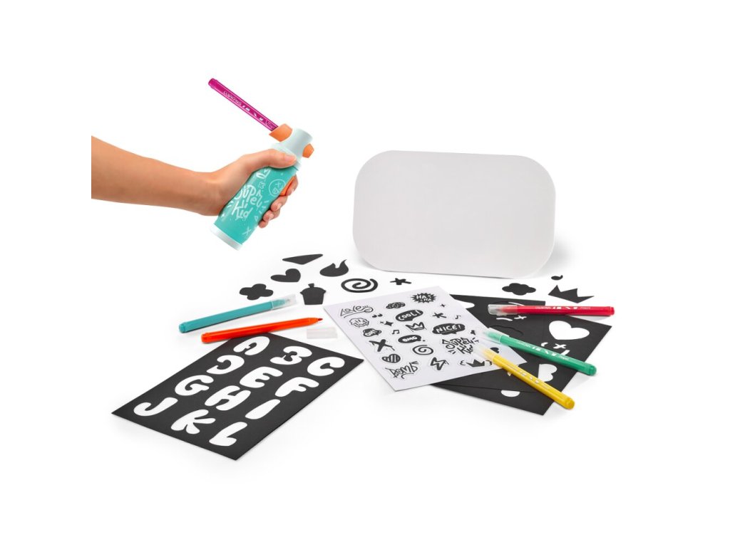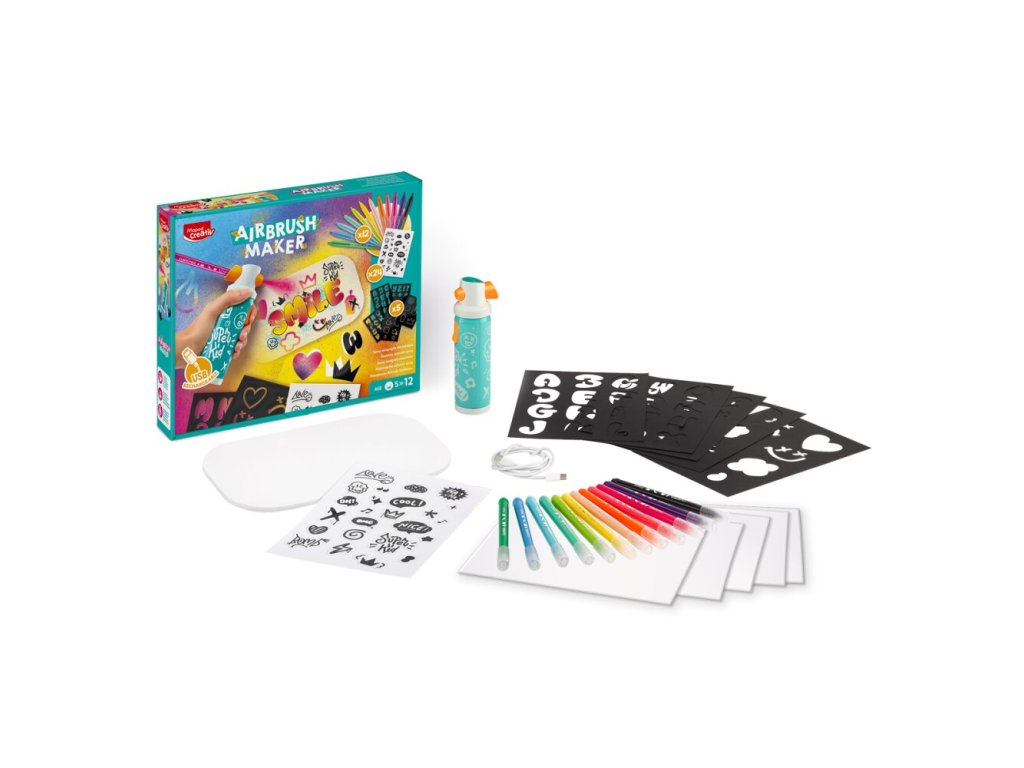 Sada Maped Creativ Airbrush Maker promění klasické fixy na spray-art – děti vytvoří zářivé obrázky jako z graffiti, ale zcela bezpečně a bez nepořádku.