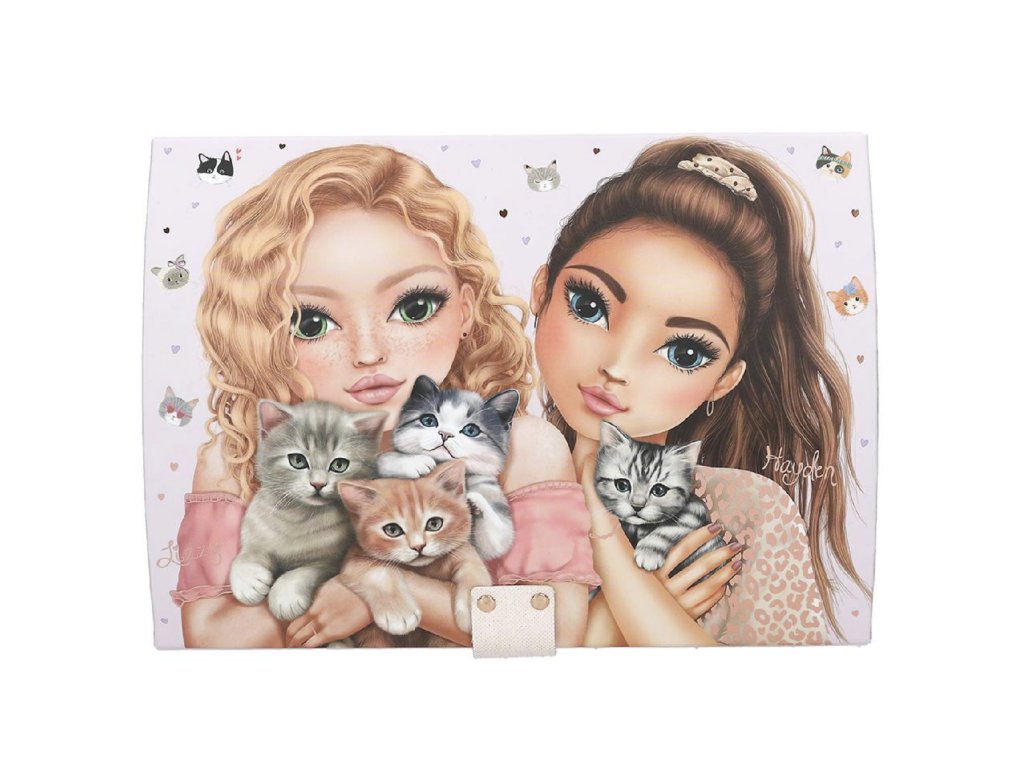 Roztomilá dětská šperkovnice Top Model Cat Love – Hayden & Lizzy 🐱💖 je dokonalým místem pro bezpečné uložení všech pokladů. Přední stranu zdobí portréty oblíbených modelek Hayden a Lizzy spolu s motivem koťátek 🐾, které potěší každou milovnici zvířat i značky Top Model.