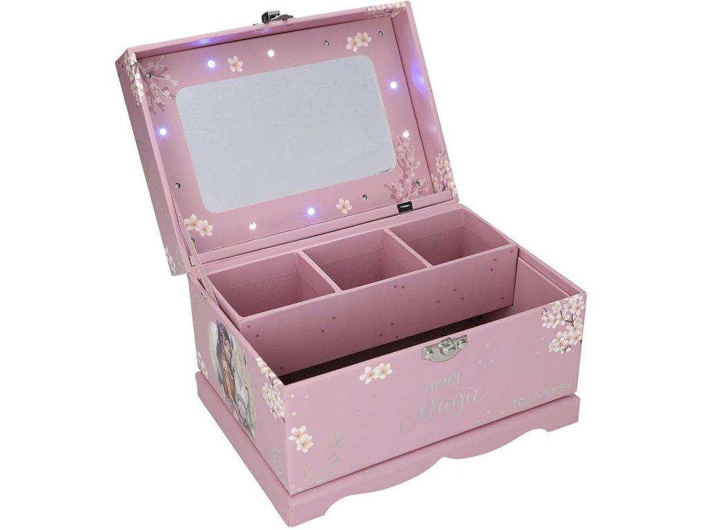 Při otevření šperkovnice se navíc rozsvítí LED světelný efekt 💡, který dodává celému zážitku kouzelnou atmosféru. Uvnitř se nachází praktické přihrádky na prstýnky 💍, náušnice či náramky a velké zrcátko, které usnadní zkoušení doplňků.