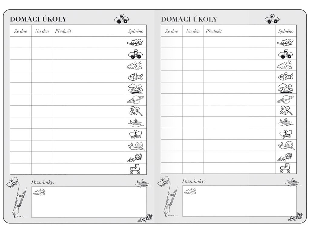📅 Na začátku úkolníčku najdete rozvrh hodin, který pomůže dětem s organizací školního týdne. Každá stránka nabízí dostatek prostoru pro zápis úkolů, poznámek či důležitých informací.