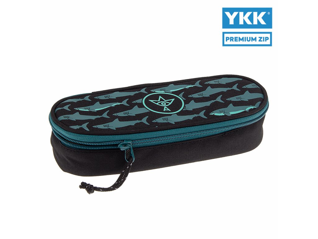 Oválný školní penál s jedním úložným prostorem se zapínáním na zip a elastickým poutkem k lepšímu zapínání vhodný především pro chlapce.