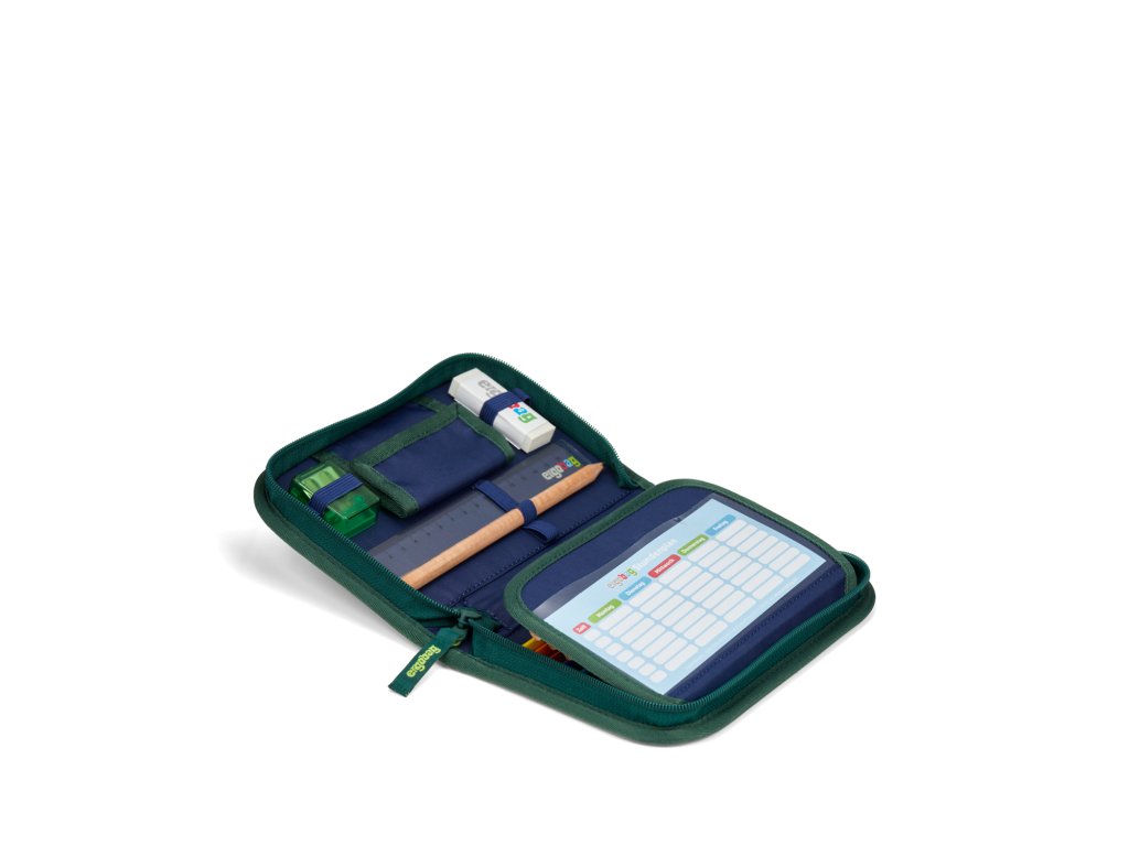 🎒 Ergobag penál Rex je prostorný jednopatrový penál s chlopní a přihrádkou na rozvrh hodin – ideální pro žáky, kteří chtějí mít psací potřeby vždy po ruce. Vyroben je z recyklovaných PET lahví, což z něj činí ekologickou volbu pro děti i rodiče