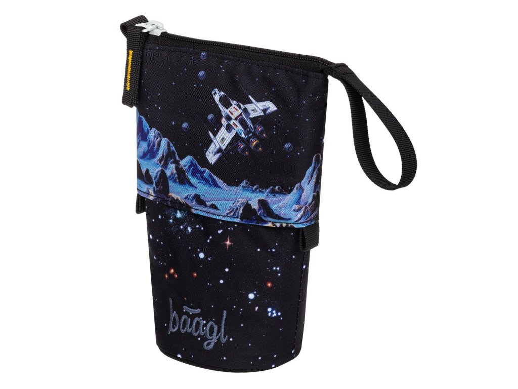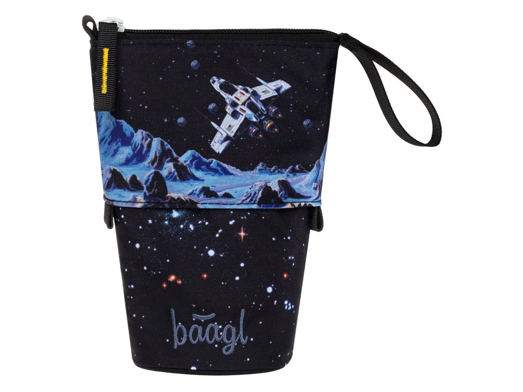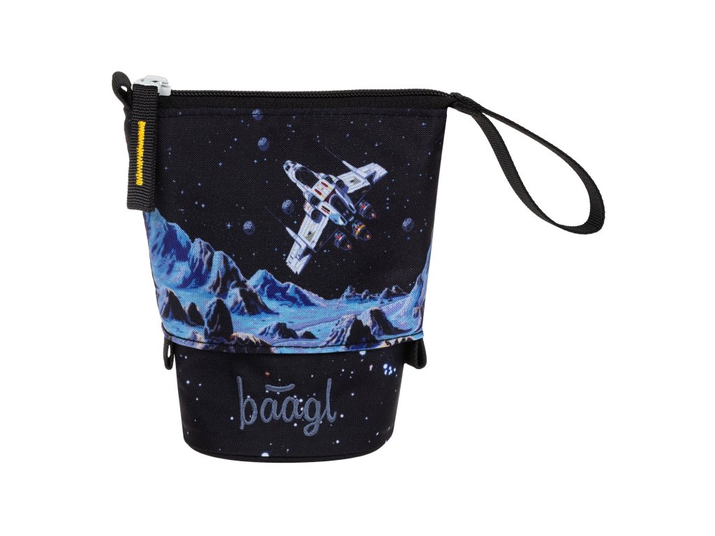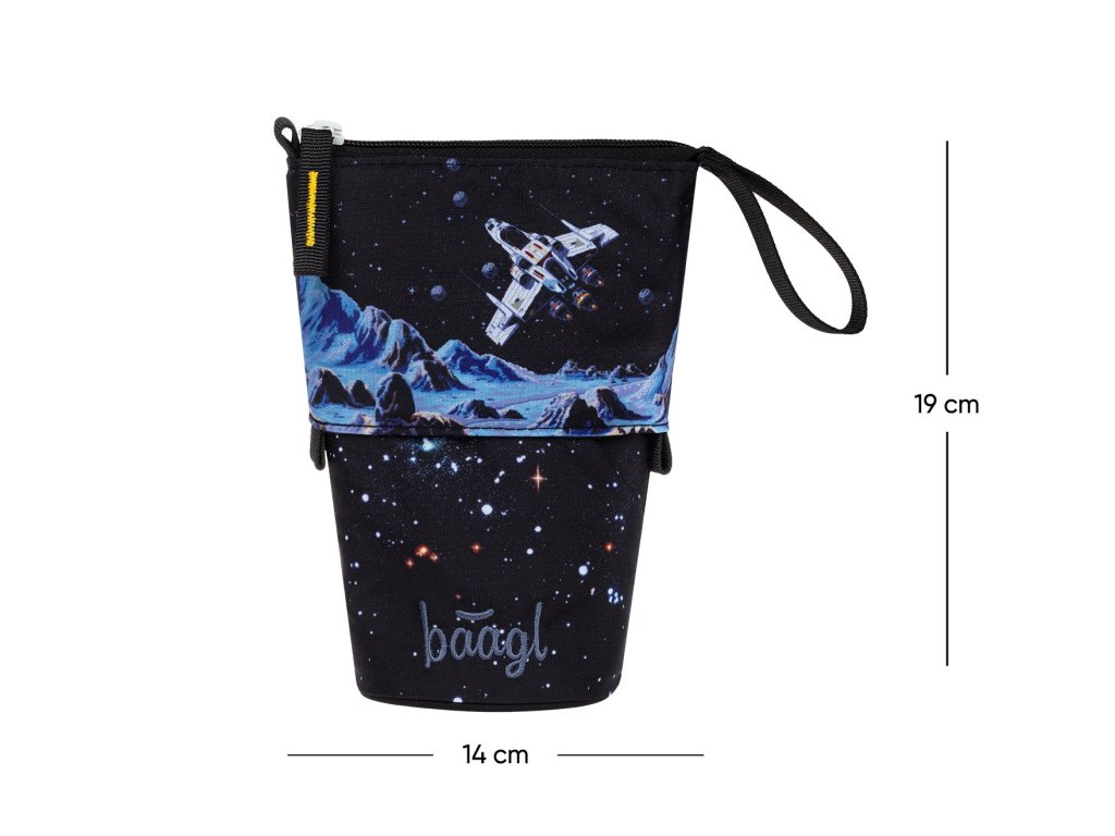 Jednopatrový penál Baagl Pixel Space s chlopněmi, kapsičkou i rozvrhem. Kvalitní zip YKK a dostatek místa pro pastelky!