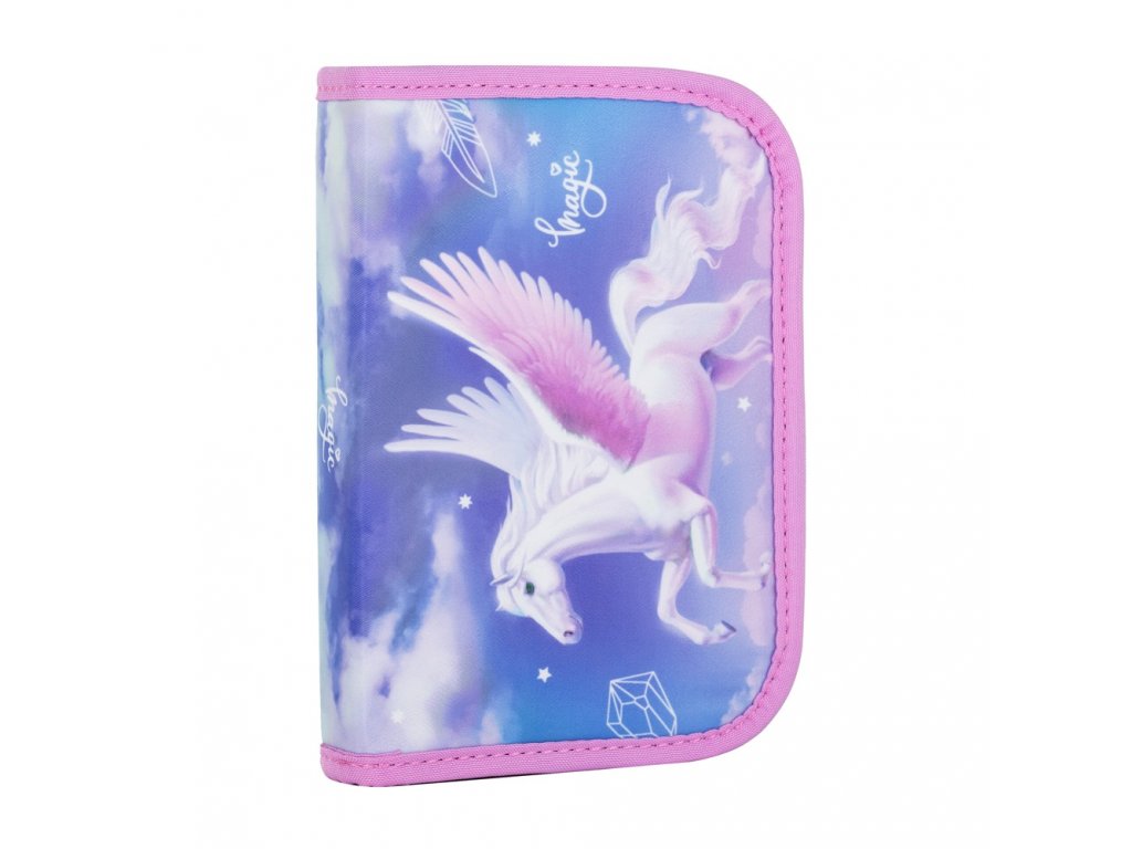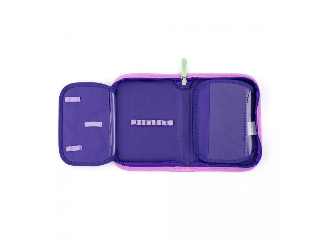 Jednopatrový školní penál se 2 chlopněmi, prázdný obsahuje 25 gumových poutek pro uchycení psacích potřeb. Na vnitřních chlopních jsou průhledné fólie pro rozvrh hodin.