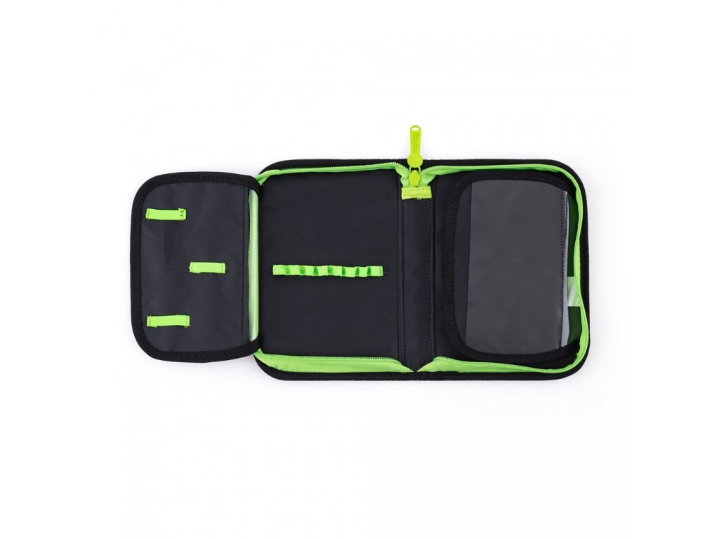 Jednopatrový školní penál se 2 chlopněmi, prázdný obsahuje 25 gumových poutek pro uchycení psacích potřeb. Na vnitřních chlopních jsou průhledné fólie pro rozvrh hodin.