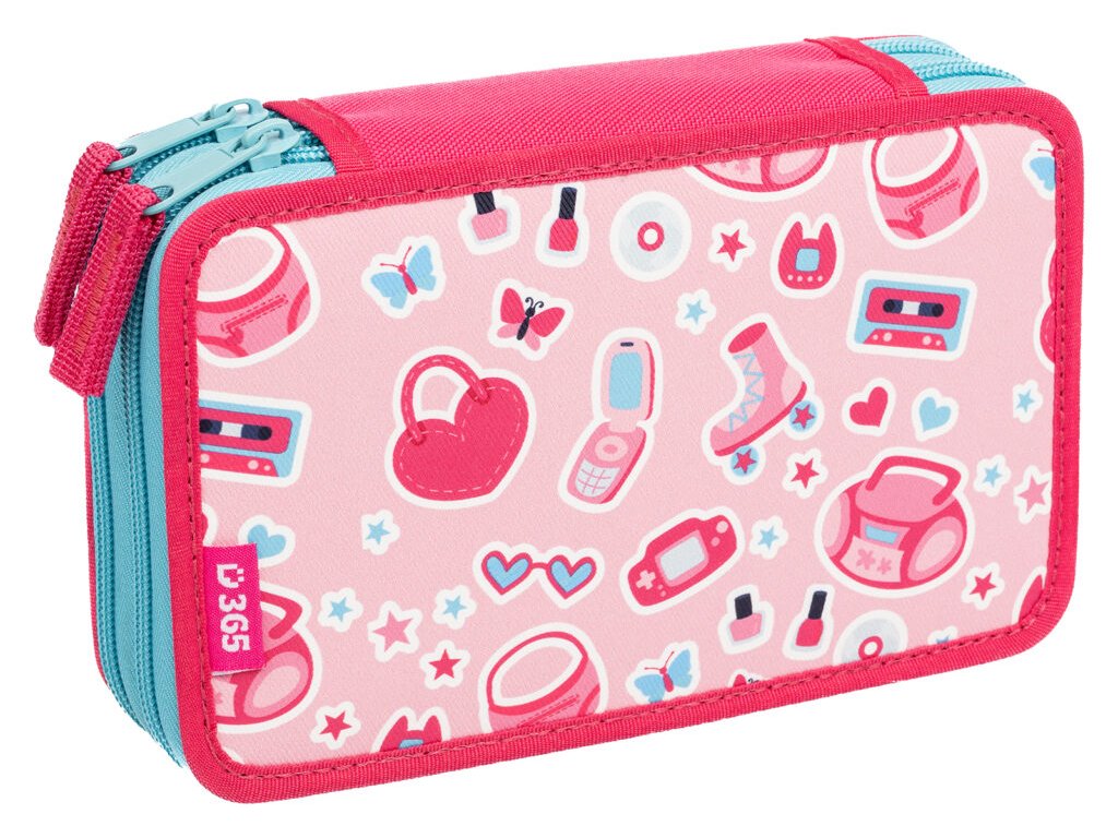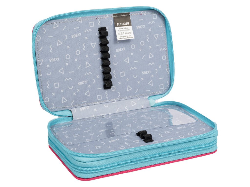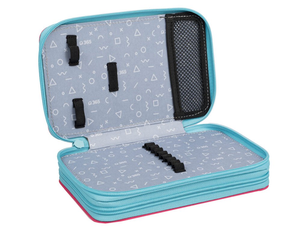 Dvoupatrové penály obsahují v prvním patře 8 gumiček na pastelky a tužky, dále gumičky na ořezávátko, gumu či nůžky a nyní nově síťovanou kapsičku s pružným lemem pro uložení drobností.