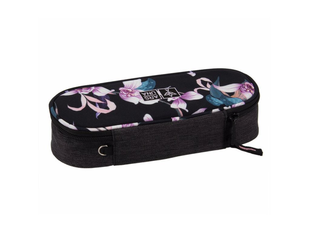 Jednoduchý školní penál válcovitého typu z květinové kolekce Orchideje od výrobce Ars Una s jednou komorou a malou kapsou na zip uvnitř, bez výbavy.