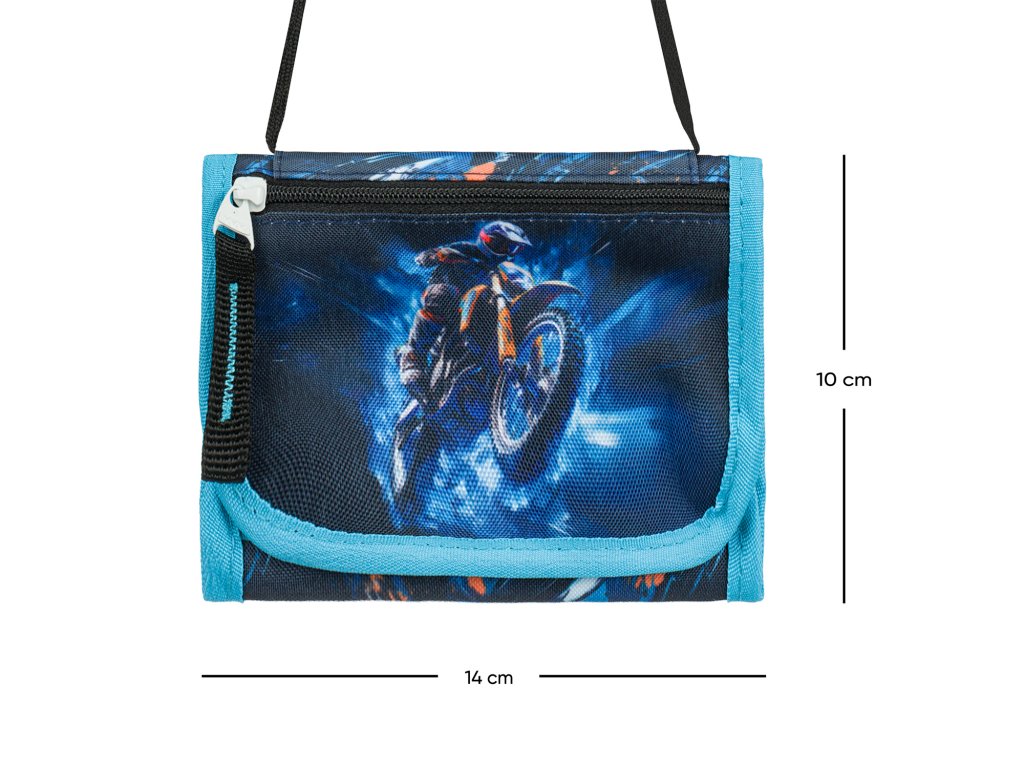 Peněženka nese výrazný motiv motorky na tmavě modrém podkladu – ideální volba pro všechny malé motorkáře. Vzhledově i barevně ladí s ostatními školními produkty Baagl Motorka.