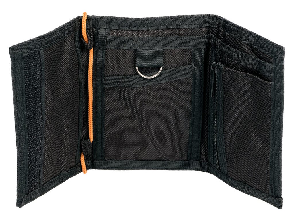 Peněženka se snadno uzavře suchým zipem a pohodlně se nosí na krku díky pevné látkové šňůrce.