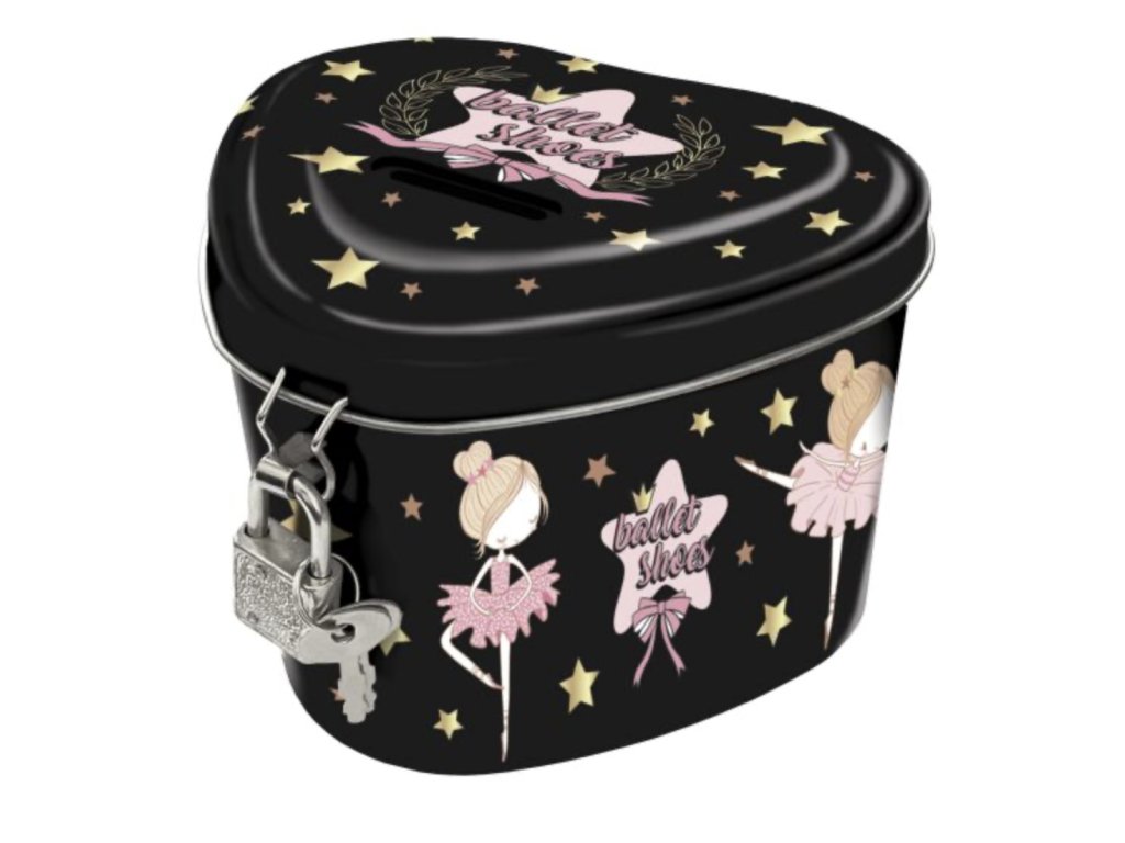 Plechová pokladnička Srdce Baletka pomůže dětem naučit se hospodařit s penězi zábavnou formou. Pevné plechové provedení, zámek a roztomilý motiv s baletkou potěší každou malou princeznu.