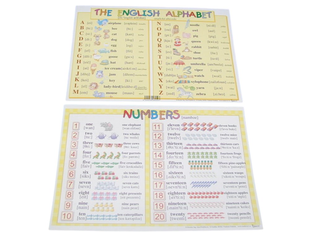 Tabulka A4 – Anglická abeceda a číslovky je ideální pomůcka pro malé školáky, kteří se začínají učit anglický jazyk. Díky jednoduchému zpracování nabízí jasný přehled základních slovíček a čísel.