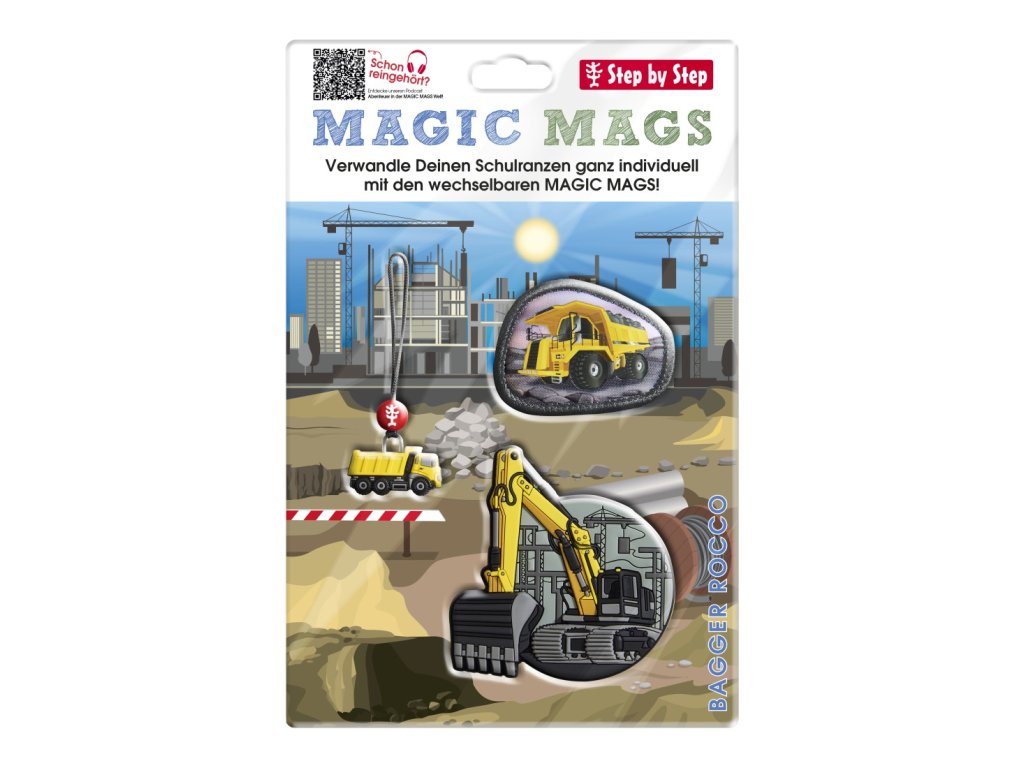 MAGIC MAGS Bagger Rocco je sada vyměnitelných magnetických motivů, díky kterým si děti vyzdobí batoh přesně podle sebe. Ideální pro malé milovníky bagrů a stavebních strojů!