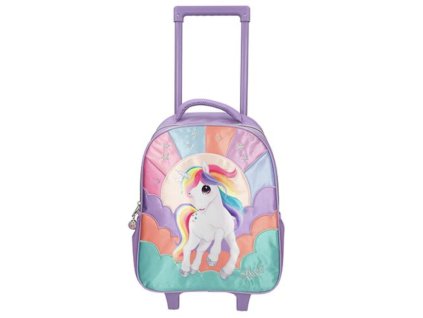 Dětský cestovní kufr Ylvi s motivem jednorožce a výsuvnou fialovou rukojetí. Dvě svíticí kolečka, velké otevírání na dva zipy, přední kapsy na zip a vyztužené stěny pro lepší...