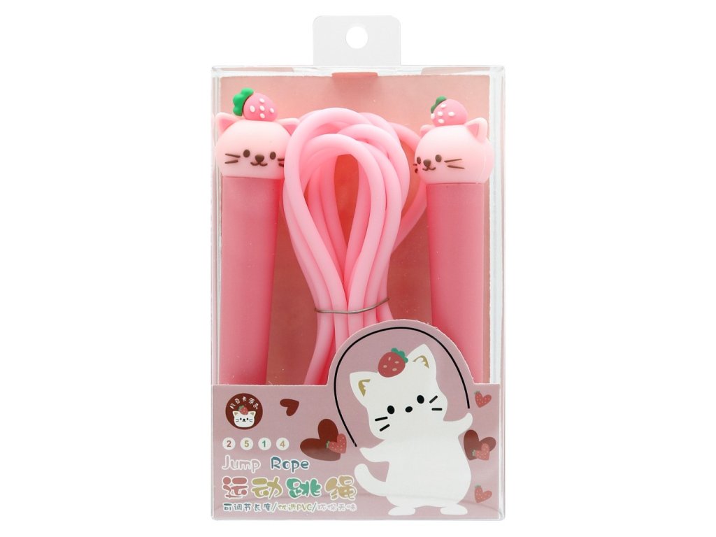 Růžové dětské švihadlo 2,8 m – kočka s jahodou je ideální na hřiště, do tělocviku i na domácí dovádění. Díky měkkému silikonovému provazu se s ním dobře skáče a roztomilý detail zvířátka na rukojeti děti jednoduše baví.