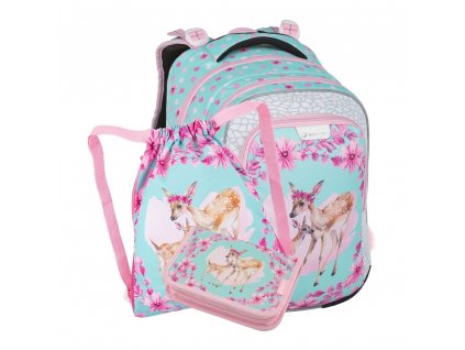 Cenově zvýhodněná školní sada pro školačku ve 2.-5. třídě. Školní set obsahuje školní batoh, penál a sáček na přezuvky.