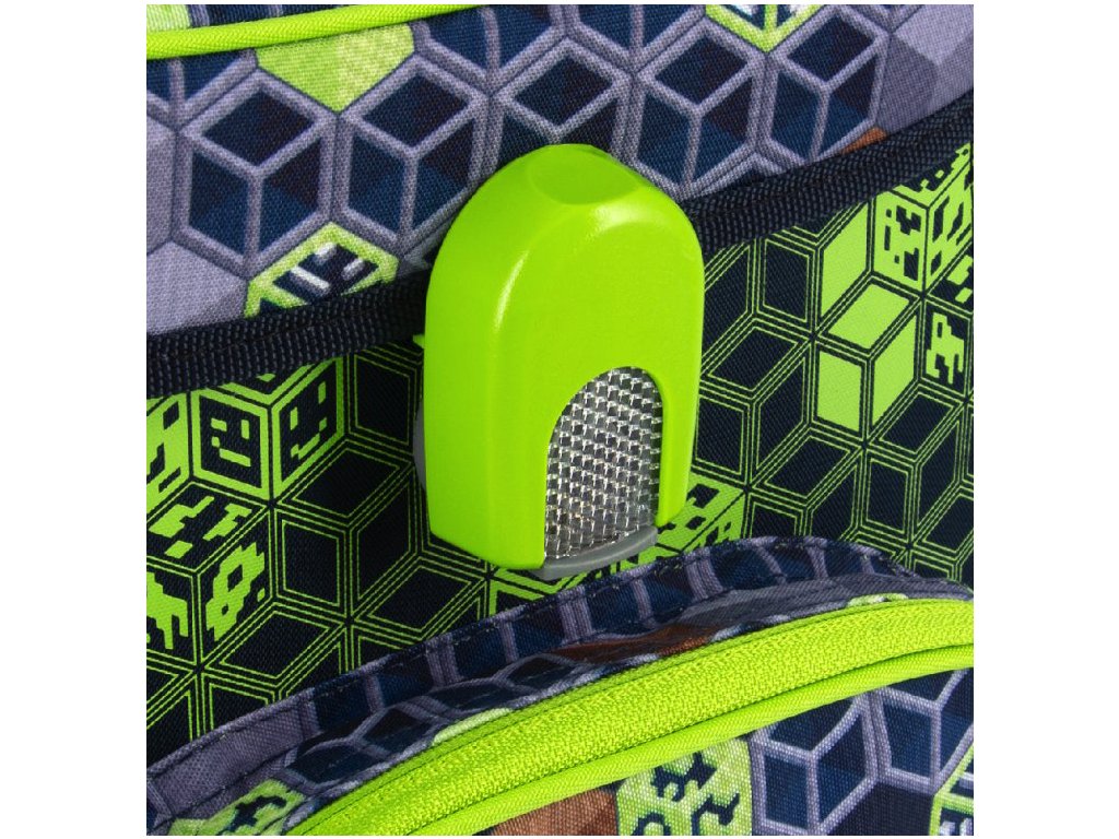 Dno je pevné a voděodolné s dostatečnou výškou, která zabraňuje prosáknutí vody do aktovky. Zároveň celá aktovka je voděodolná a není nutné dokupovat navíc pláštěnku. Na aktovce naleznete spoustu bezpečnostních prvků v podobě reflexních pásek. V hlavní komoře je jedna velká velká přihrádka s jedním dělením na velké učebnice, sešity či boxy, dále pak vnitřní přihrádka na zip pro bezpečné uložení např. peněženky či mobilního telefonu. Na bocích jsou dvě prostorné přihrádky na suchý zip, které pojmou láhev na pití či přezůvky.Výhodou těchto dvou přihrádek je jejich variabilita, kdy v normálním stavu je přihrádka složená ke stěně aktovky a v případě potřeby se jednoduše roztáhne. V přední části aktovky je přihrádka na zip, která je vhodná pro svačinový box. Doporučujeme použít svačinový box z naší kolekce, který zaručuje, že se do přihrádky vejde. Další výhodou jsou tříbodové nastavitelné a velmi komfortní ramenní popruhy.