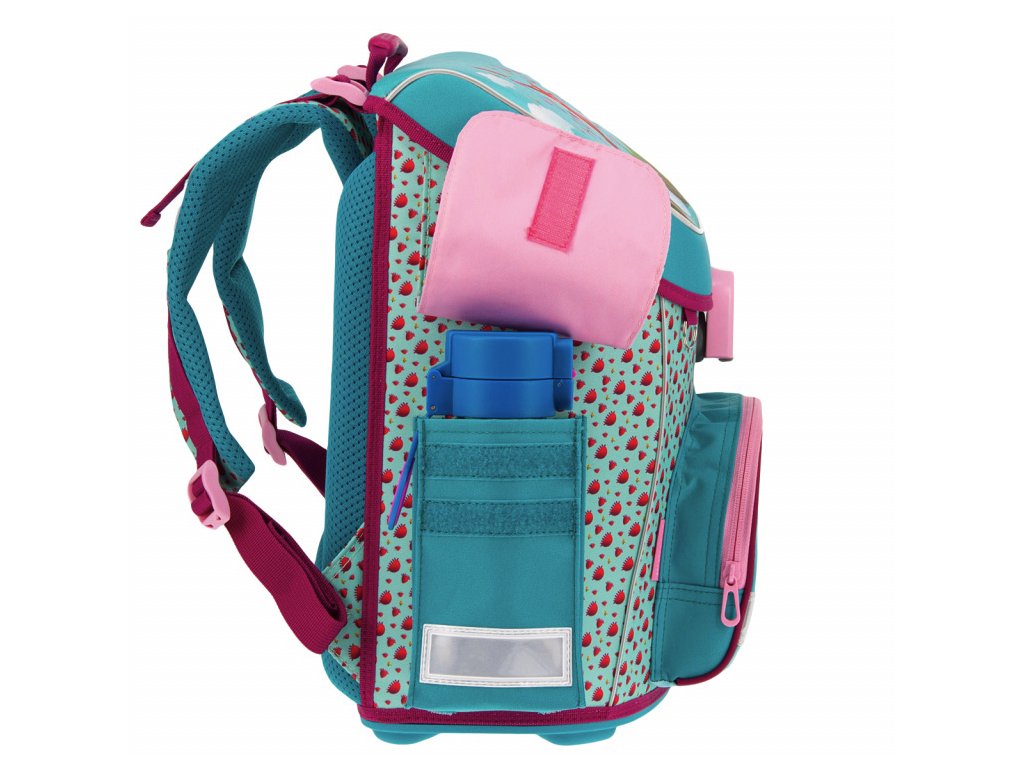 - Po obou bocích jsou dvě prostorné přihrádky na suchý zip, které pojmou láhev na pití či poslouží jako přenos přezůvek. Jejich výhodou je variabilita, kdy v normálním stavu je přihrádka složená ke stěně aktovky a v případě potřeby se jednoduše roztáhne.