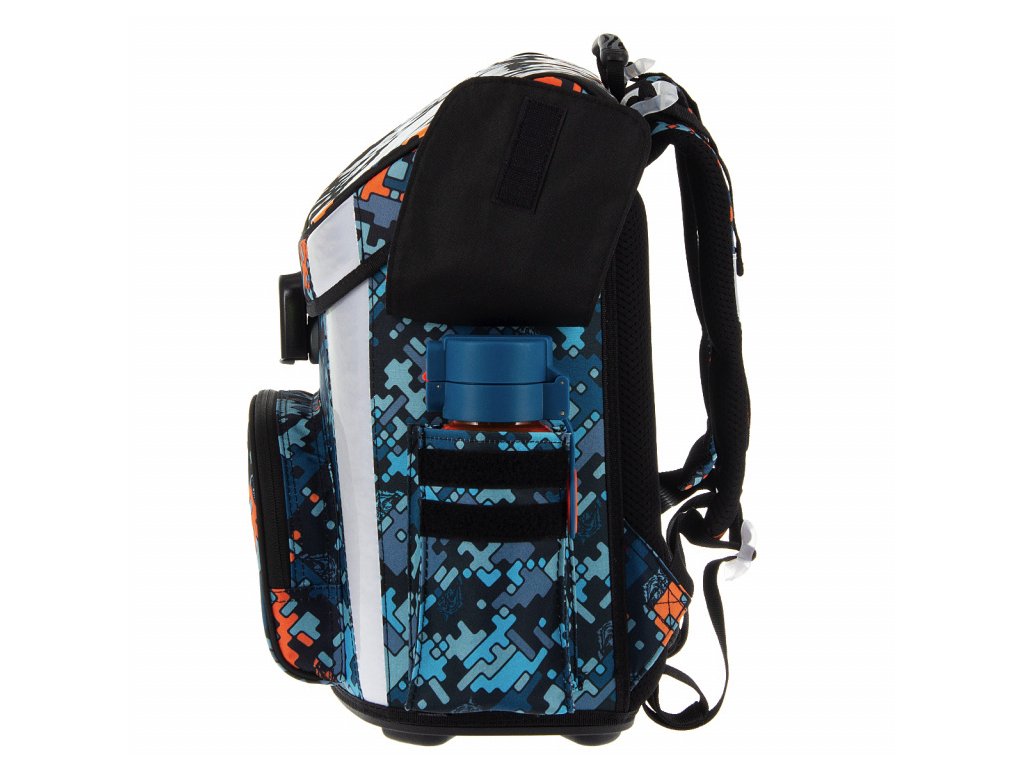 - Po obou bocích jsou dvě prostorné přihrádky na suchý zip, které pojmou láhev na pití či poslouží jako přenos přezůvek. Jejich výhodou je variabilita, kdy v normálním stavu je přihrádka složená ke stěně aktovky a v případě potřeby se jednoduše roztáhne.