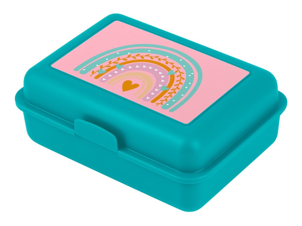 🌈 Stylový tyrkysový box na svačinu s duhovým motivem. Praktická přepážka pro oddělení potravin, bezpečné uzavírání a kompaktní rozměry – ideální pro školní batoh! 🎒🍎