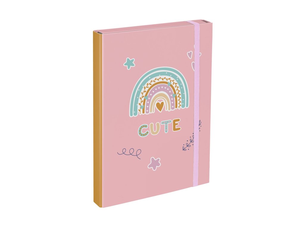 Pevné desky na sešity formátu A5 s růžovo-duhovým motivem. S vnitřní kapsou a zavíráním na gumičku proti vypadnutí obsahu.