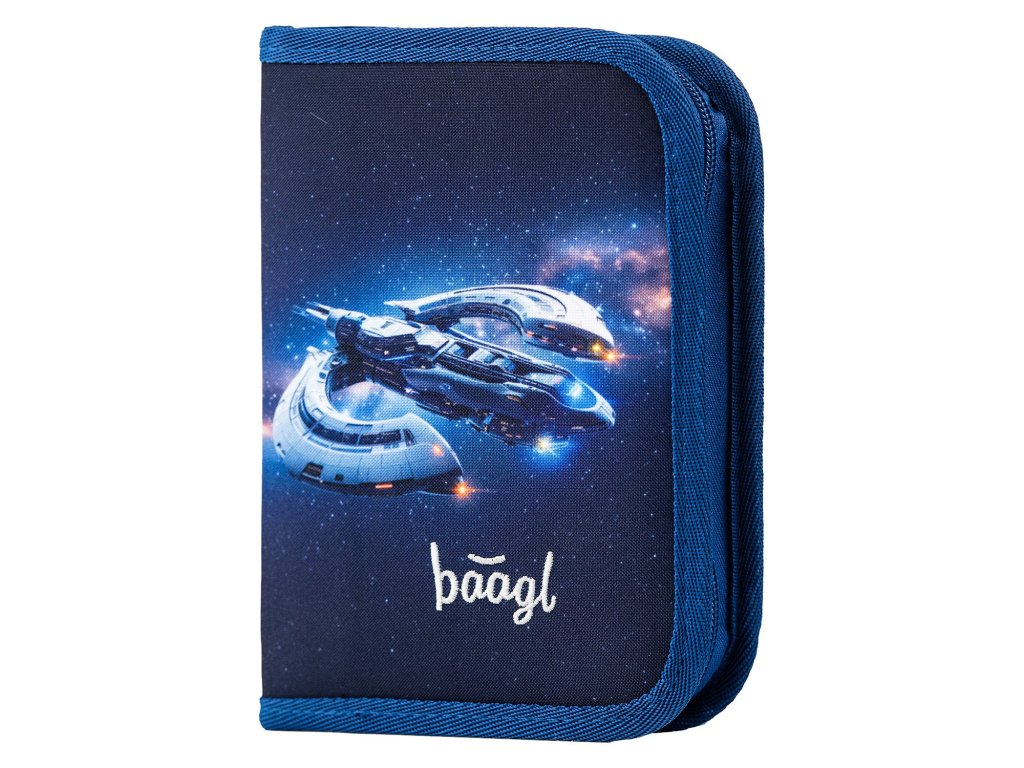 Jednopatrový penál Baagl s vesmírnou lodí má dvě chlopně, kvalitní gumičky a kapsičku na drobnosti. Ideální pro školáky, kteří milují vesmír.