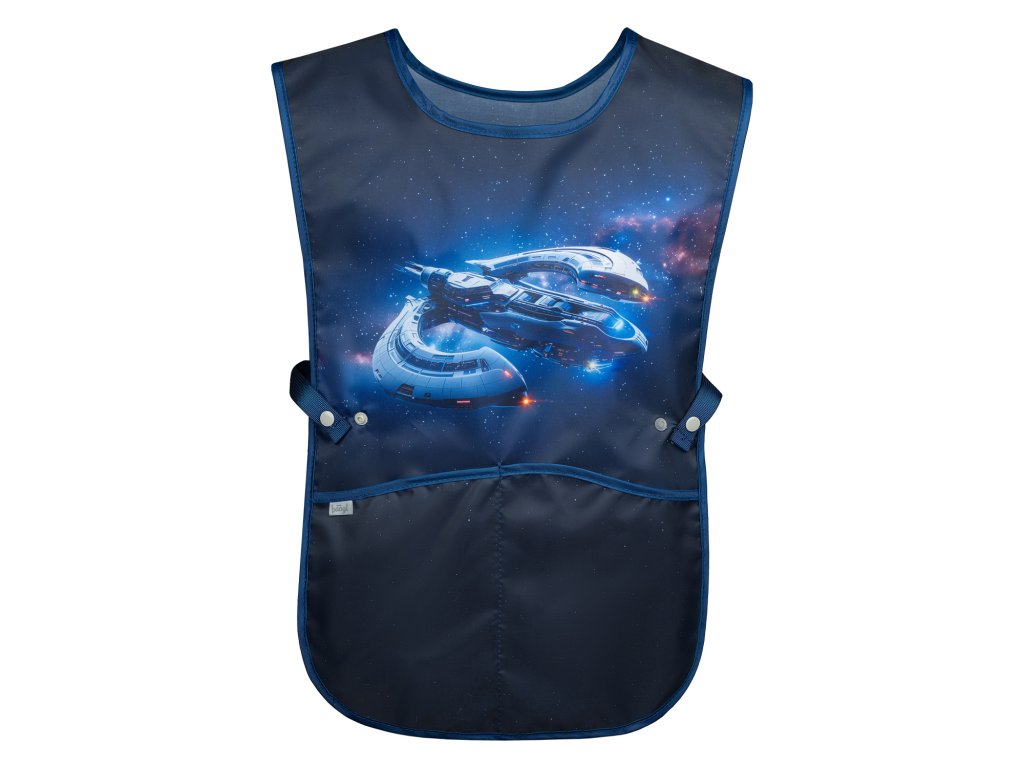 Praktická dětská zástěra Baagl s motivem vesmírné lodi. Omyvatelný materiál, dvě kapsy a pohodlné nošení. Ideální na výtvarku i kroužky.
