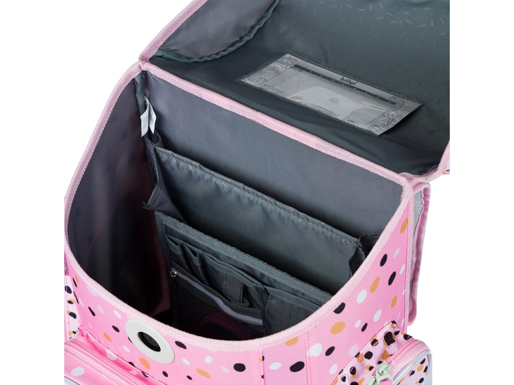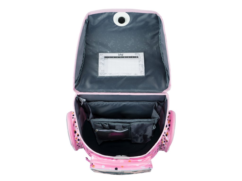• Uvnitř aktovky je průhledná kapsa s rozvrhem a vnitřní organizér umožňující rovnoměrné rozložení hmotnosti.