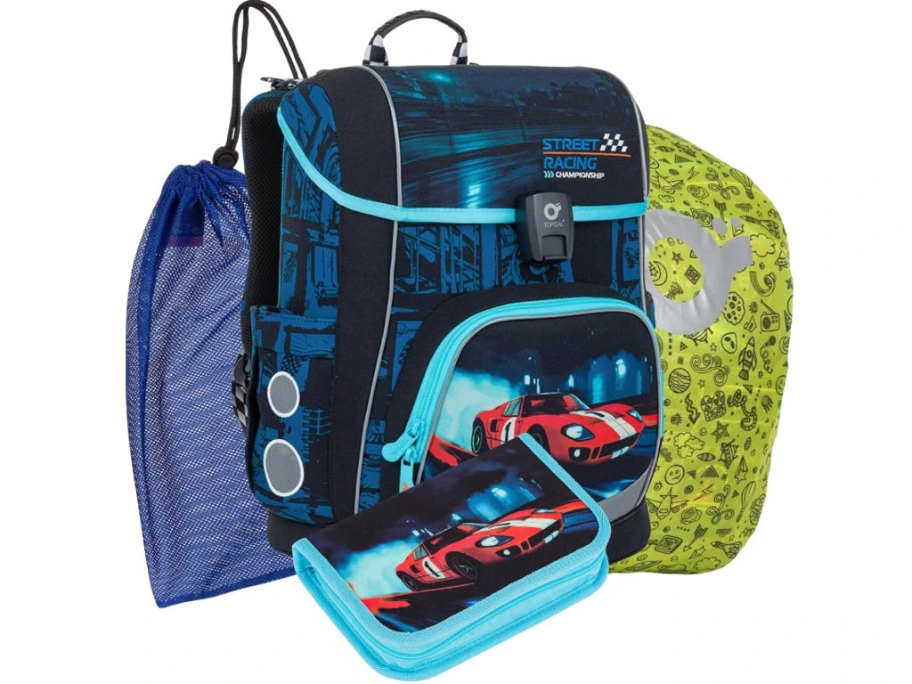 Školní aktovka Topgal AIRA 26012 nadchne všechny kluky, kteří milují auta, rychlost a dobrodružství. Dynamický modro-černý design se závodním motivem je ideální do školy i na každodenní nošení 🚗