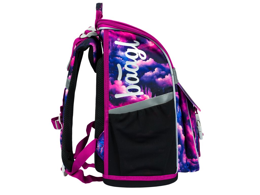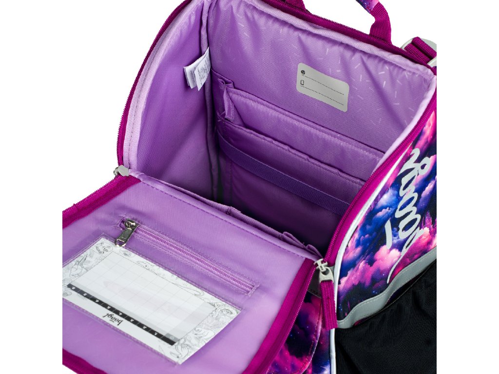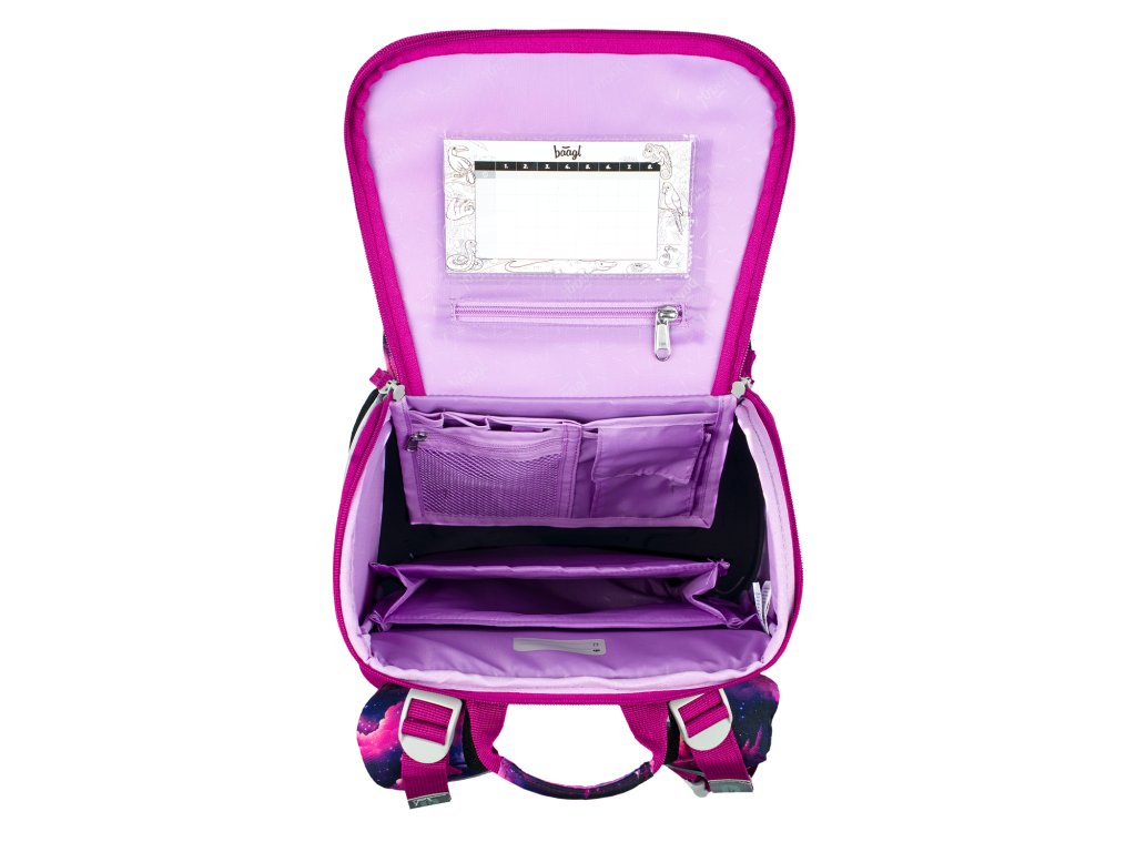 • Uvnitř aktovky je průhledná kapsa na rozvrh a vnitřní organizér umožňující rovnoměrné rozložení hmotnosti, doplněný gumičkou pro fixaci.