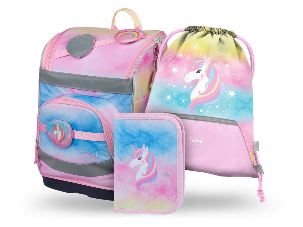 Baagl školní set Zippy Plus Rainbow Unicorn – aktovka, penál a sáček