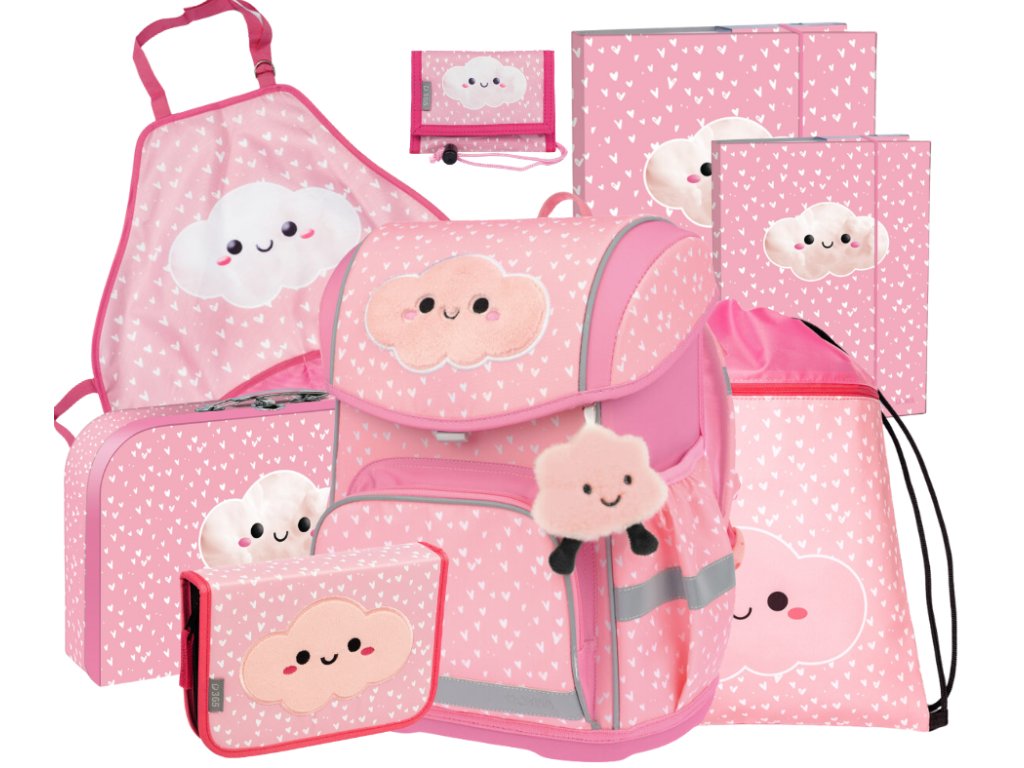 Růžový motiv Cloud kombinuje jemné pastelové odstíny, obláčky a decentní detaily. Set působí moderně, hravě a zároveň elegantně – ideální volba pro malé školačky.