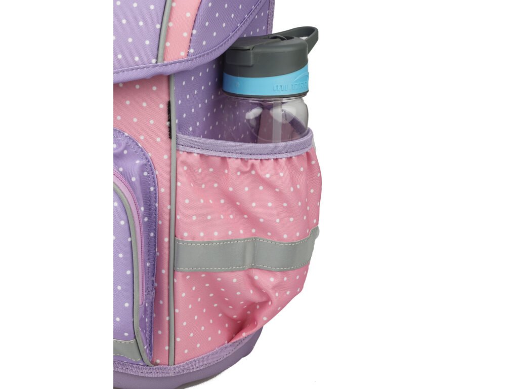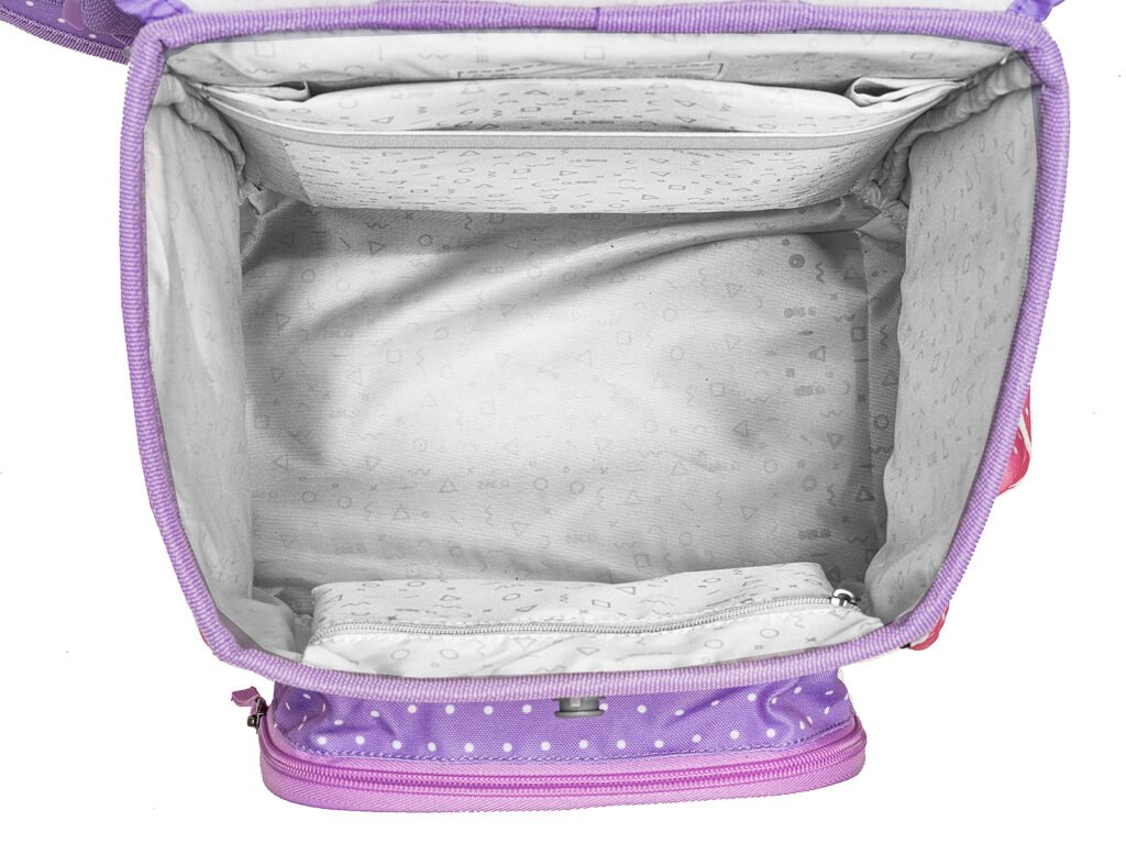 Hlavní vnitřní komora má praktické členění – nechybí kapsička na drobnosti, štítek na jméno a adresu, odnímatelný kroužek na klíče ani průhledná kapsa na rozvrh. Samostatná kapsa na lunch box je částečně termoizolační, aby uchovala teplotu svačiny. Po stranách aktovky najdete kapsy na lahev nebo deštník s elastickými lemy pro ochranu obsahu před rozlitím.