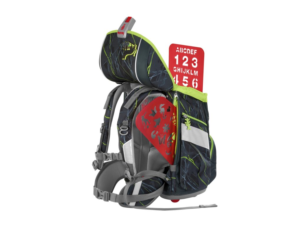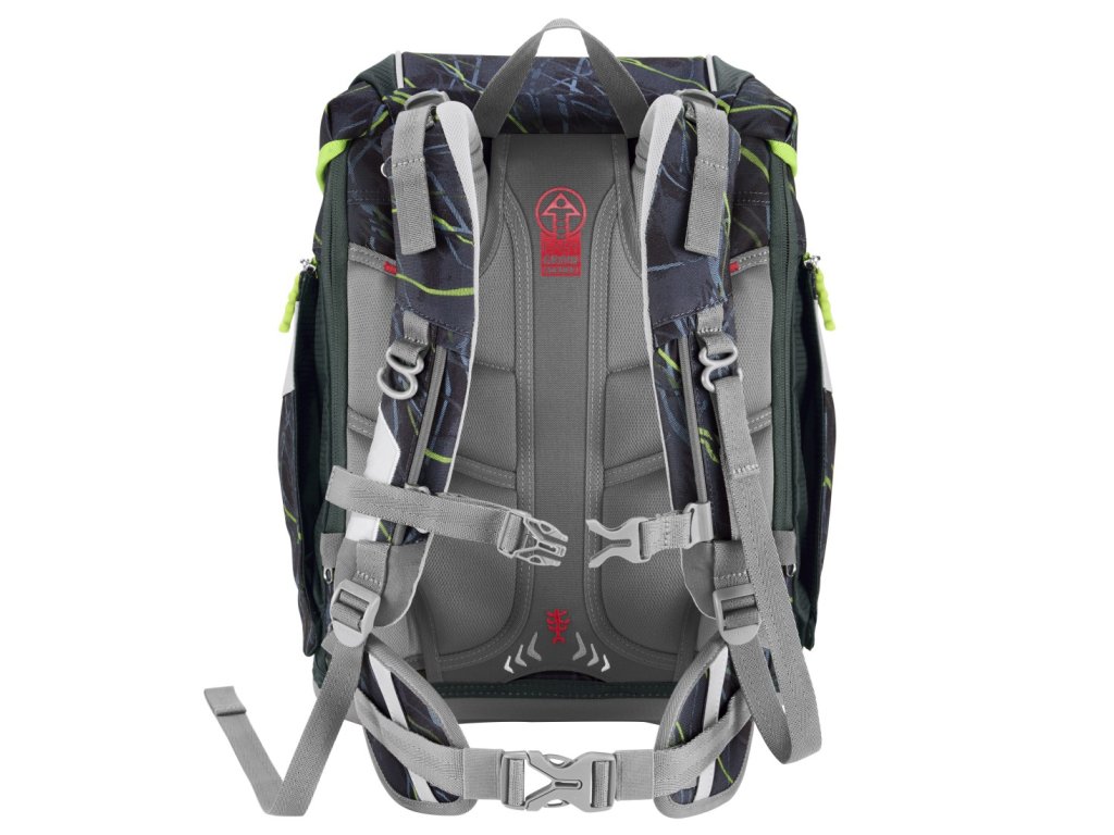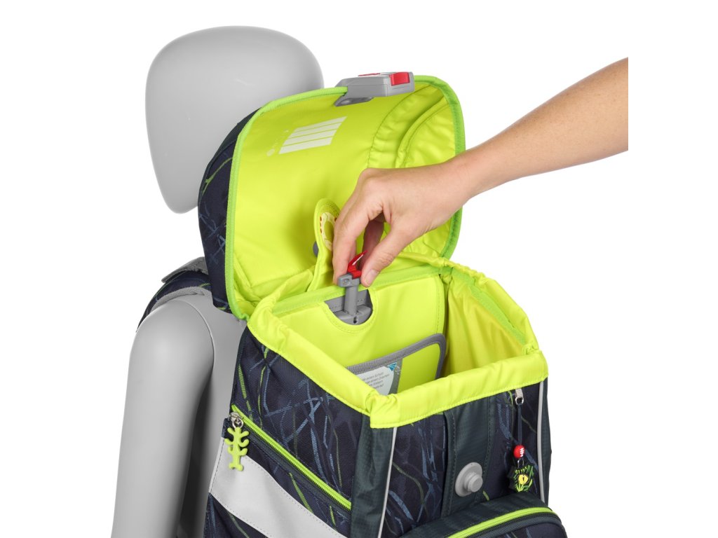 - možnost plynulého výškového nastavení ramenních popruhů pomocí otočného mechanismu uvnitř aktovky, zajišťuje přesné nastavení ramenních popruhů přímo na zádech dítěte