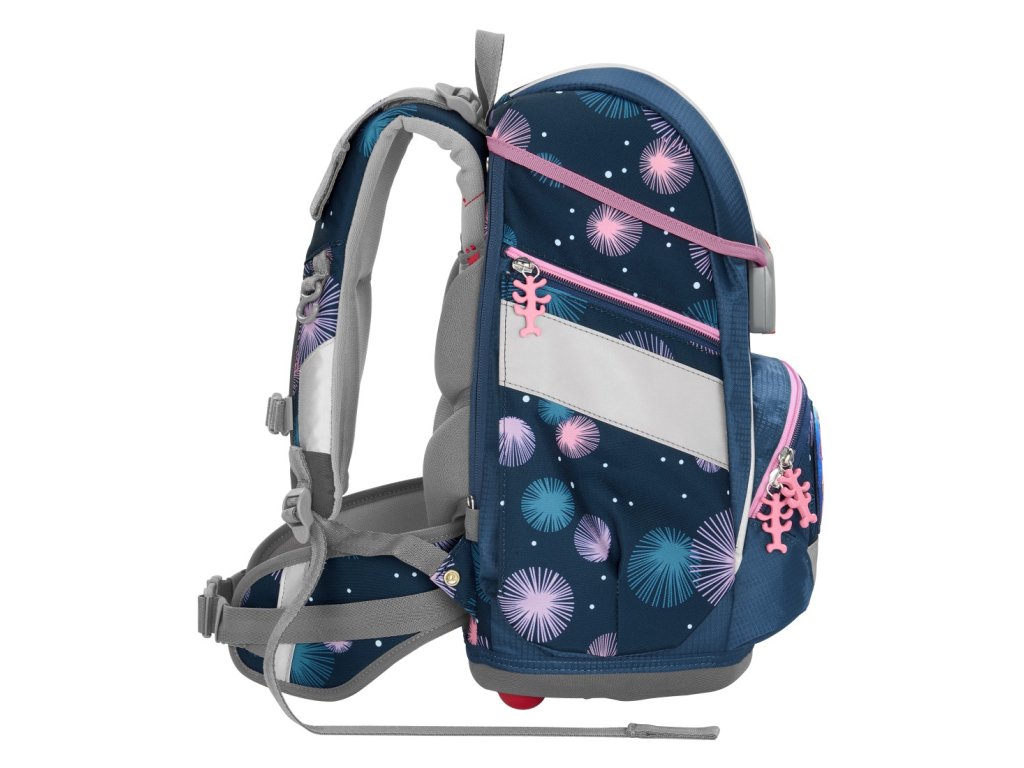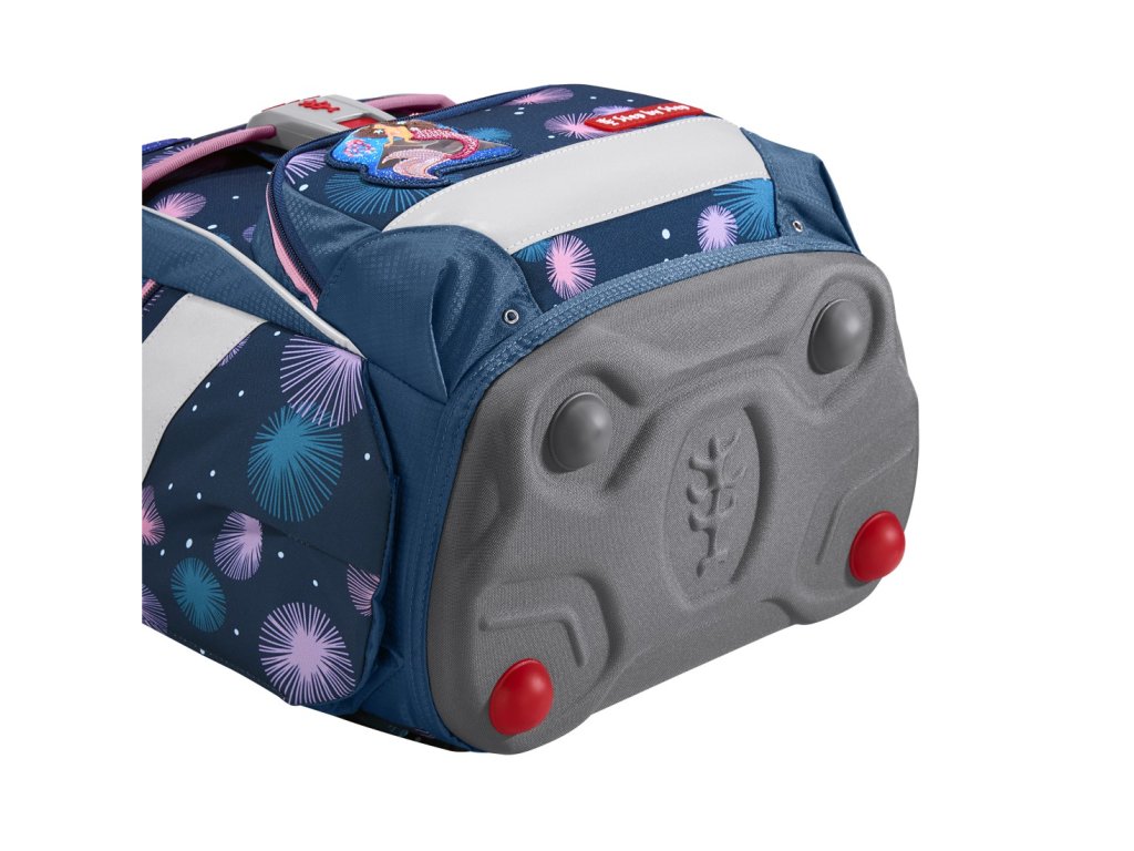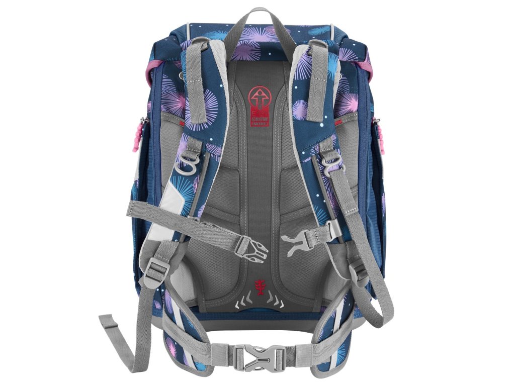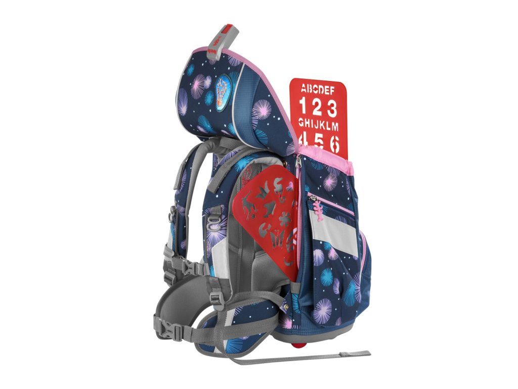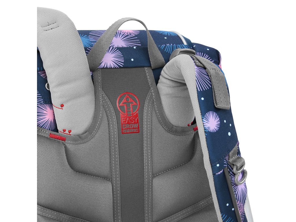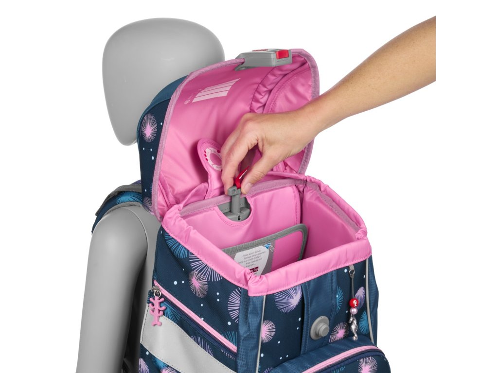 - možnost plynulého výškového nastavení ramenních popruhů pomocí otočného mechanismu uvnitř aktovky, zajišťuje přesné nastavení ramenních popruhů přímo na zádech dítěte