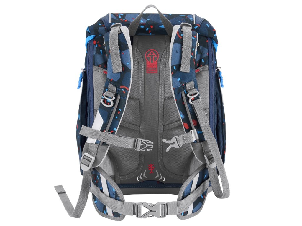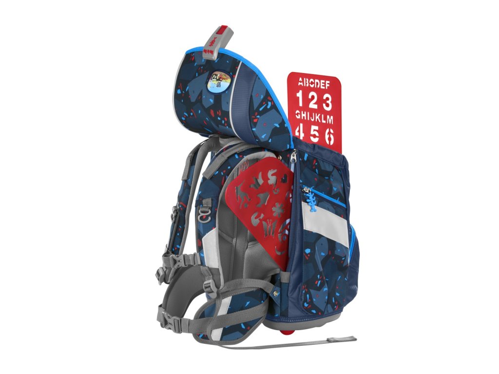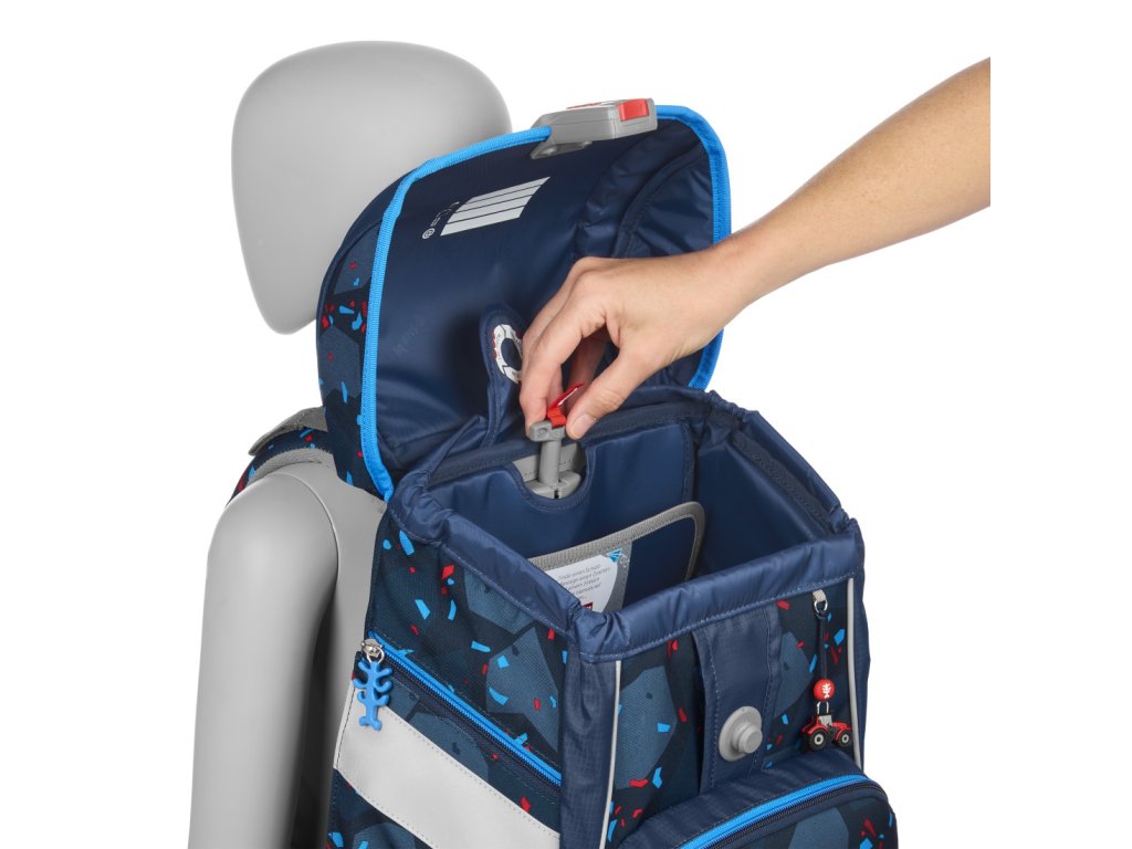 - možnost plynulého výškového nastavení ramenních popruhů pomocí otočného mechanismu uvnitř aktovky, zajišťuje přesné nastavení ramenních popruhů přímo na zádech dítěte