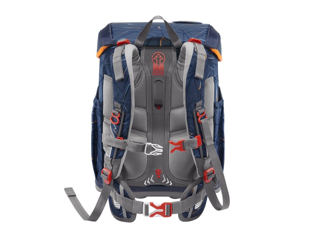 - možnost plynulého výškového nastavení ramenních popruhů pomocí otočného mechanismu uvnitř aktovky, zajišťuje přesné nastavení ramenních popruhů přímo na zádech dítěte