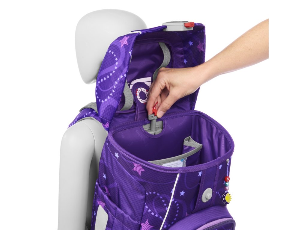 Ultralehký zádový panel ze skelných vláken, ergonomicky tvarovaná záda s prodyšným polstrováním a S-tvarované ramenní popruhy podporují správné držení těla. Výškově nastavitelný hrudní popruh a odnímatelný bederní páspomáhají aktovku stabilizovat a výrazně odlehčují dětským zádům.