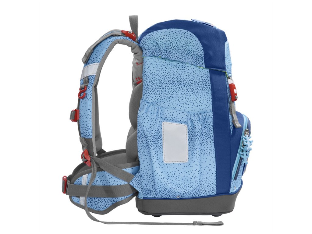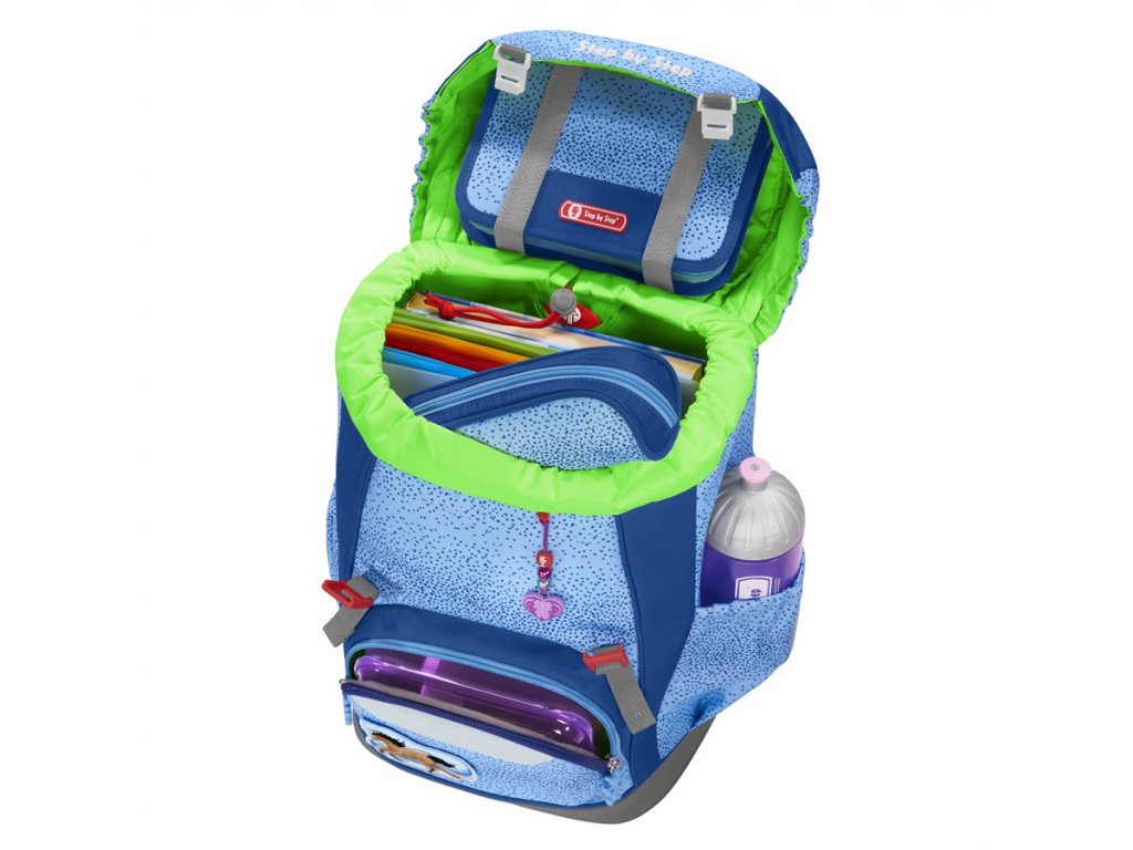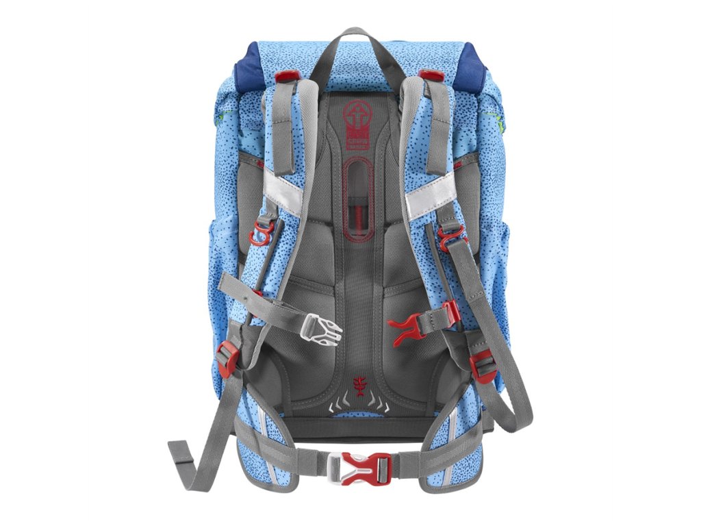 Batoh je doplněn o reflexní prvky ze všech stran, velkou hlavní komoru, kapsy na láhev i svačinu a praktickou kapsu na těžké učebnice.
