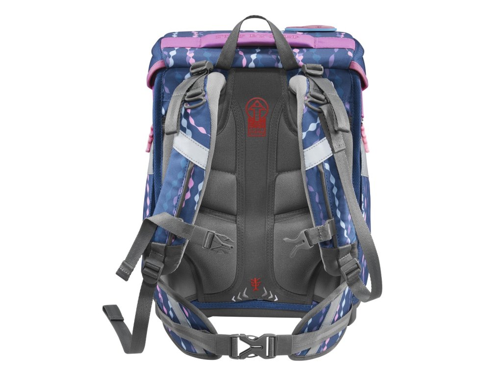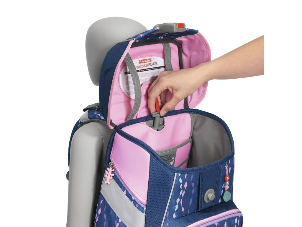 - možnost plynulého výškového nastavení ramenních popruhů pomocí otočného mechanismu uvnitř aktovky, zajišťuje přesné nastavení ramenních popruhů přímo na zádech dítěte