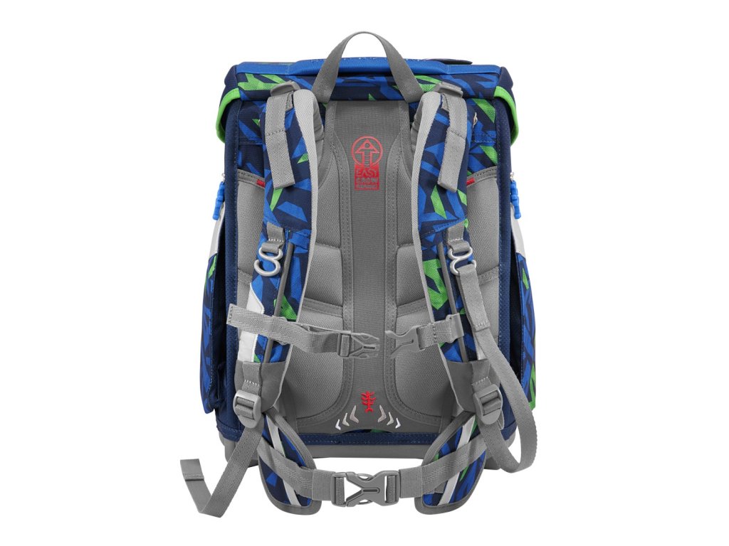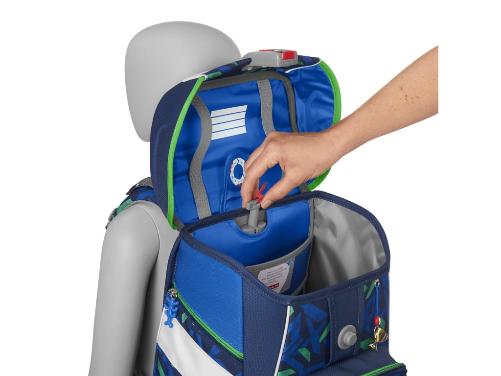 - možnost plynulého výškového nastavení ramenních popruhů pomocí otočného mechanismu uvnitř aktovky, zajišťuje přesné nastavení ramenních popruhů přímo na zádech dítěte