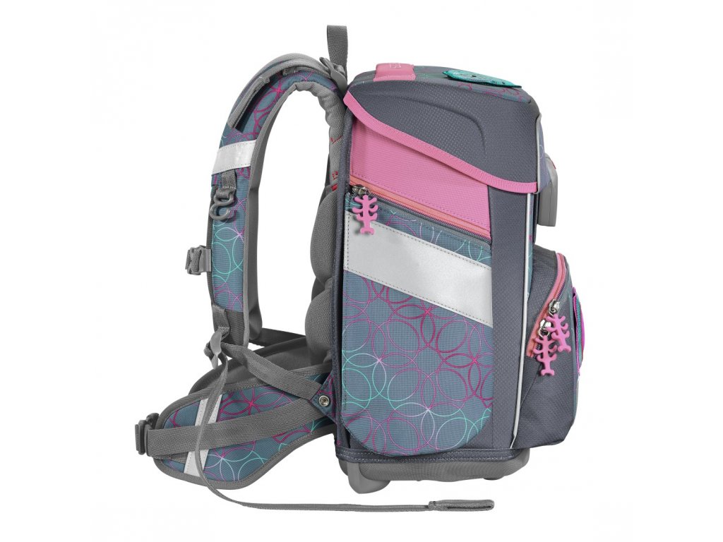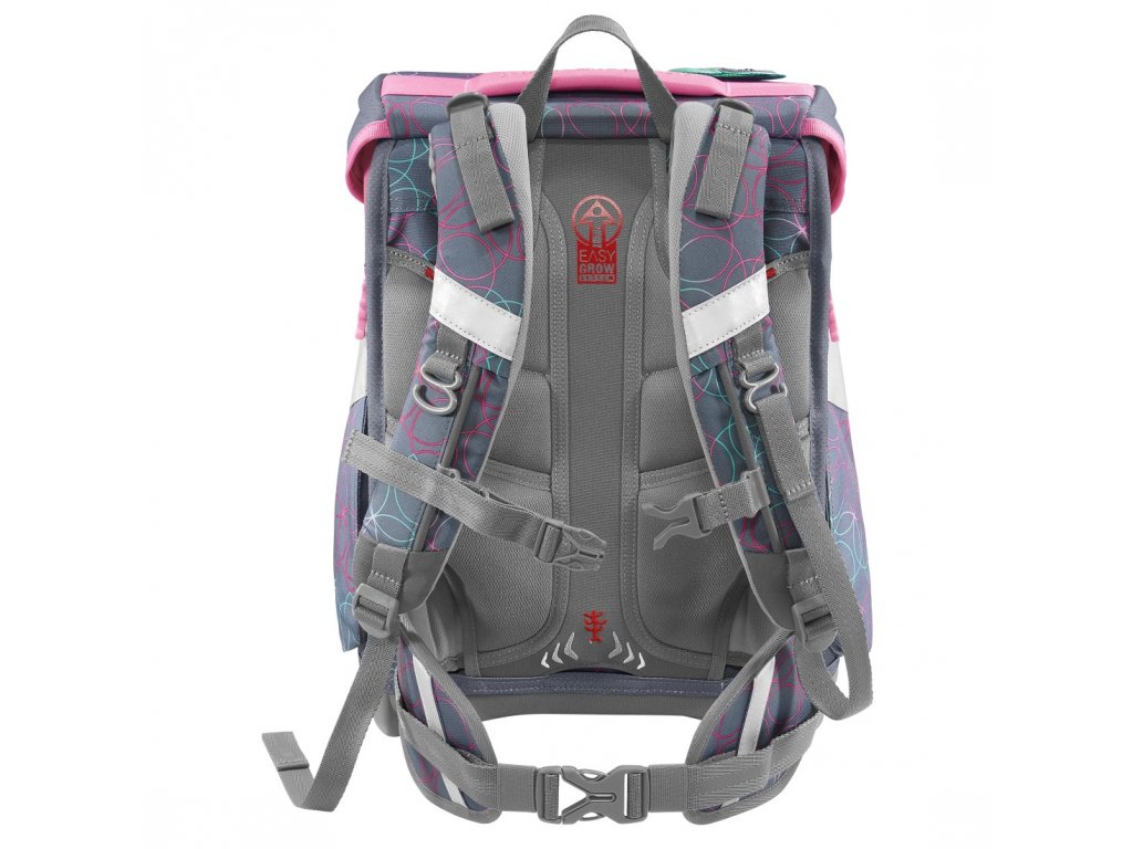 - možnost plynulého výškového nastavení ramenních popruhů pomocí otočného mechanismu uvnitř aktovky, zajišťuje přesné nastavení ramenních popruhů přímo na zádech dítěte